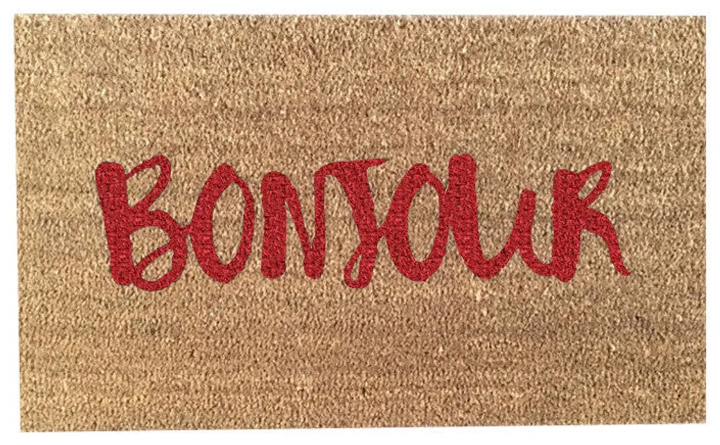 Hand Painted "Bonjour" Welcome Mat, Bleeding Heart Red