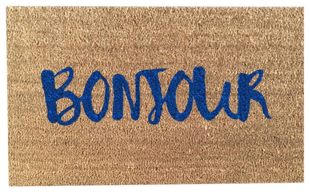 Our BONJOUR doormat is the perfect way to create an inviting and worldly entry way! Our welcome mats are hand- painted and each design is available in a wide variety of colors. - All of our mats are tan/natural brown in color. The natural coir fibers of the doormat are from the husk of the coconut which is mold and mildew resistant and have an extra- sturdy, thick vinyl backing to ensure they wont slide around, no matter the surface. Though we use all- weather paints and a UV sealant to ensure that your mat is perfect for your doorstep, we suggest that you keep your mat as dry as possible to avoid darkening of the fibers. To clean, simply shake out...easy as that! - This product is made to order. We do our best to process and ship standard orders as quickly as possible. Please observe lead times. - Color Options: Black Soul, Troubled Times Gray, Bleeding Heart, Cherry Lips, Pretty in Pink, Mr. Jones Orange, Mustard Yellow, Kelly Green, Amazon Dark Green, Breakfast at Tiffany Blue, Sophie Sky Blue, Pacific Blue, Midnight Dark Blue, CA Bear Brown, Jelly Dark Purple