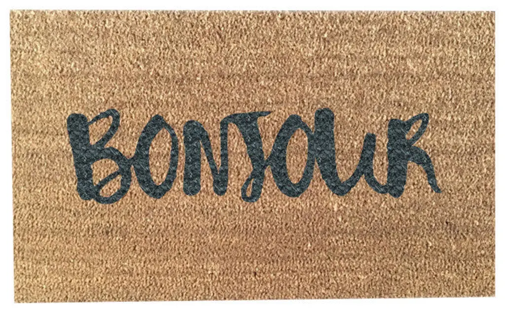 Our BONJOUR doormat is the perfect way to create an inviting and worldly entry way! Our welcome mats are hand- painted and each design is available in a wide variety of colors. - All of our mats are tan/natural brown in color. The natural coir fibers of the doormat are from the husk of the coconut which is mold and mildew resistant and have an extra- sturdy, thick vinyl backing to ensure they wont slide around, no matter the surface. Though we use all- weather paints and a UV sealant to ensure that your mat is perfect for your doorstep, we suggest that you keep your mat as dry as possible to avoid darkening of the fibers. To clean, simply shake out...easy as that! - This product is made to order. We do our best to process and ship standard orders as quickly as possible. Please observe lead times. - Color Options: Black Soul, Troubled Times Gray, Bleeding Heart, Cherry Lips, Pretty in Pink, Mr. Jones Orange, Mustard Yellow, Kelly Green, Amazon Dark Green, Breakfast at Tiffany Blue, Sophie Sky Blue, Pacific Blue, Midnight Dark Blue, CA Bear Brown, Jelly Dark Purple