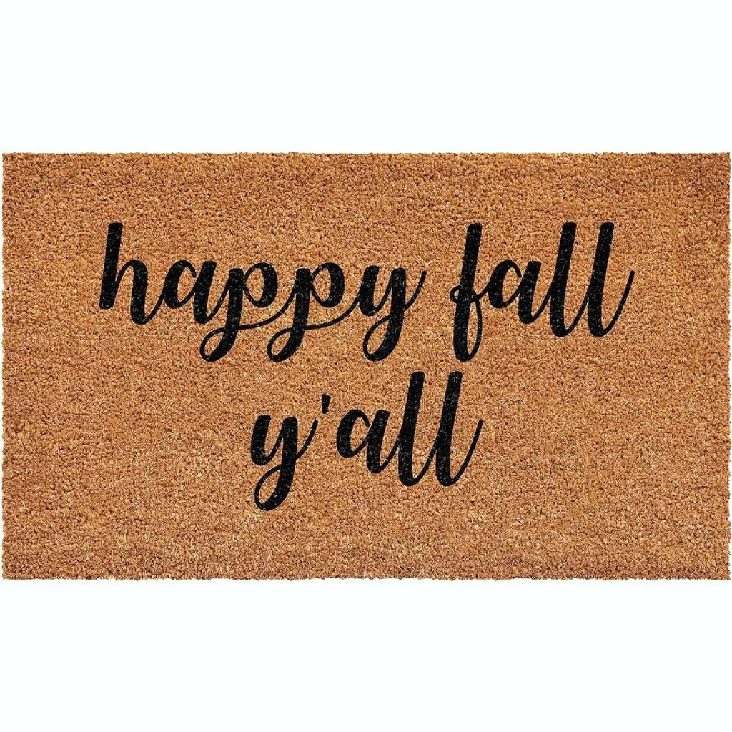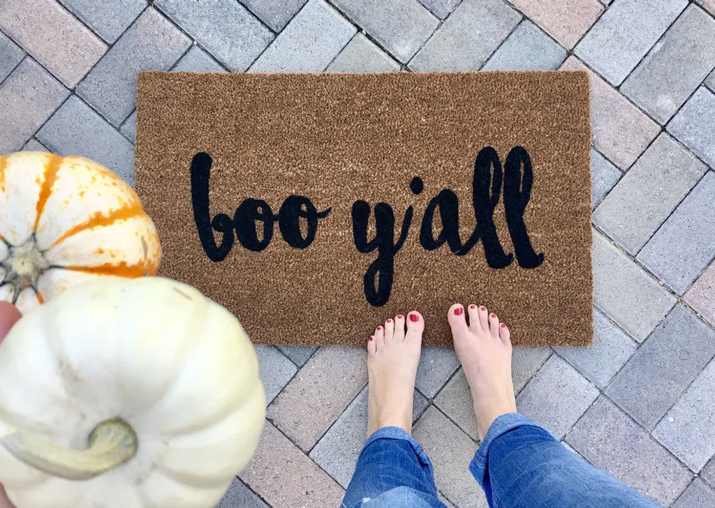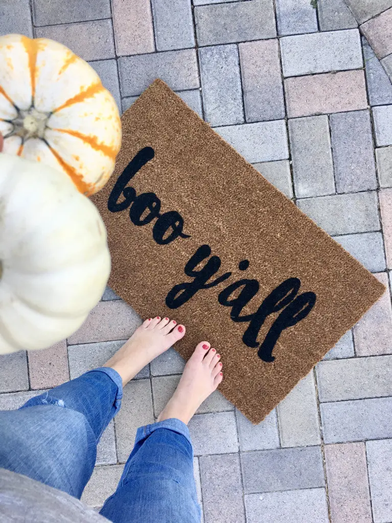 Our "boo y''all" doormat is the perfect way to create a sweet Halloween themed entry way for all of your guests! Our welcome mats are hand-painted and each design is available in a wide variety of colors.The natural coir fibers of the doormat are from the husk of the coconut which is mold and mildew resistant as well as very sturdy and durable. Our welcome mats have an extra-sturdy, thick vinyl backing to ensure they won''t slide around, no matter the surface. Though we use all-weather paints to ensure that your mat is perfect for your doorstep, we suggest that you keep your mat as dry as possible to avoid darkening of the fibers. To clean, simply shake out - easy as that!Please observe lead times as all our products are made to order.