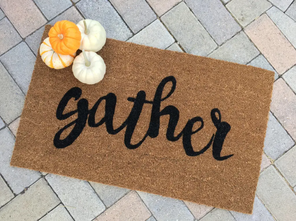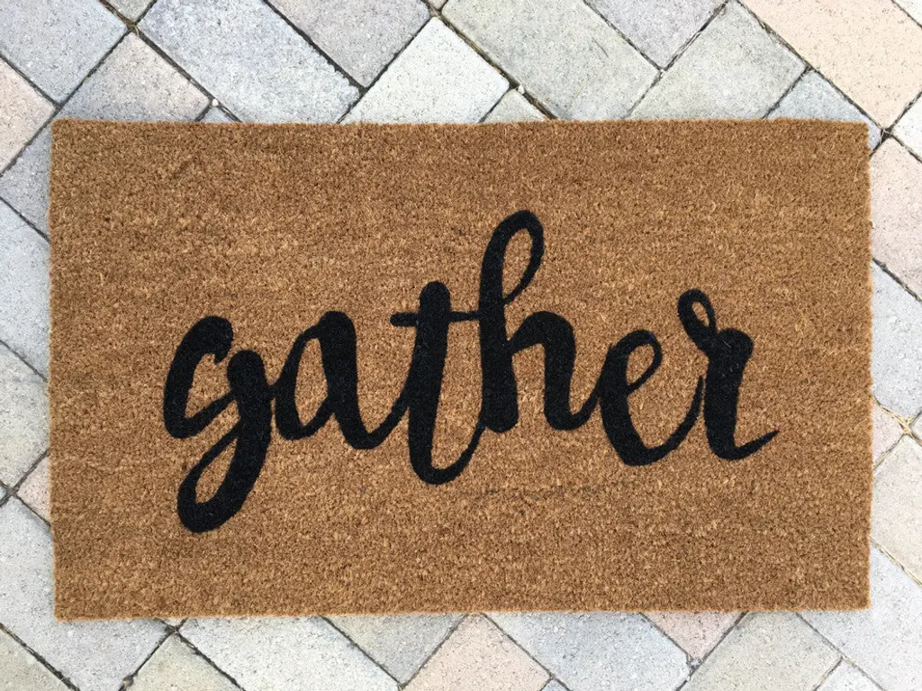 Our gather doormat is the perfect way to create a festive entryway for all of your guests! Our welcome mats are hand- painted and each design is available in a wide variety of colors. - The natural coir fibers of the doormat are from the husk of the coconut which is mold and mildew resistant as well as very sturdy and durable. Our welcome mats have an extra- sturdy, thick vinyl backing to ensure they wont slide around, no matter the surface. Though we use all- weather paints to ensure that your mat is perfect for your doorstep, we suggest that you keep your mat as dry as possible to avoid darkening of the fibers. To clean, simply shake out..easy as that! - Please view secondary image for swatch