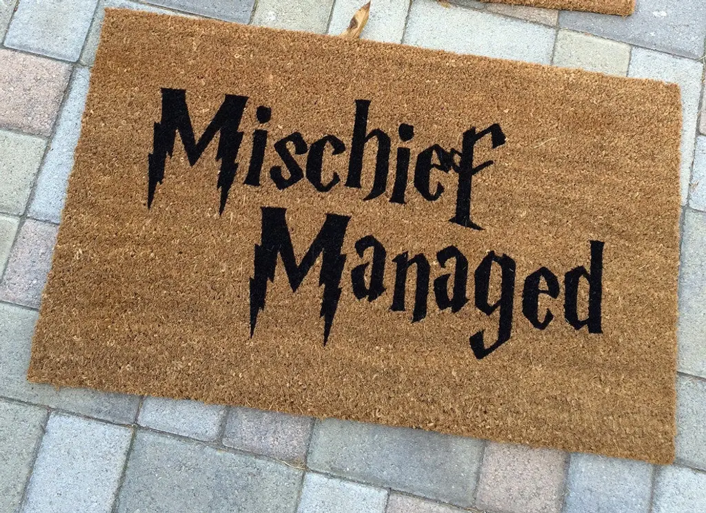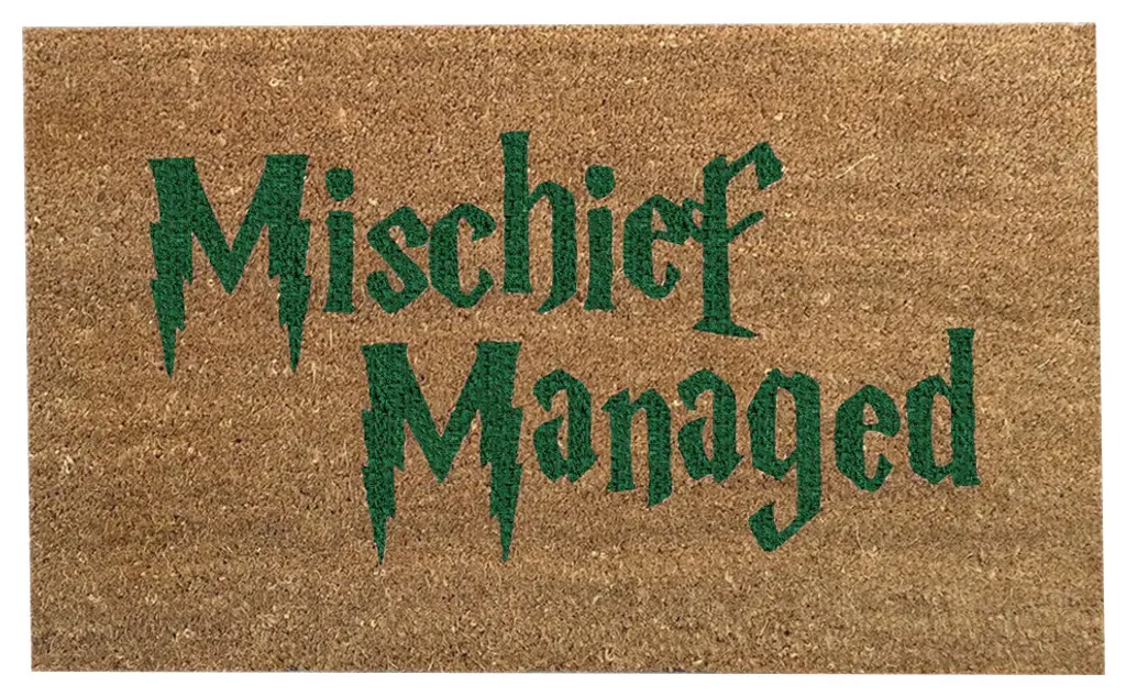 Our Potter themed doormats are the perfect way to create an inviting and fun entry way! Choose from the two designs shown in the listing photos: "I Solemnly Swear that I am Up To No Good" or "Mischief Managed". Our welcome mats are hand- painted and each design is available in a wide variety of colors. Dark colors highly recommended and show best on the rough surface of the mats.- All of our mats are tan/natural brown in color. The natural coir fibers of the doormat are from the husk of the coconut which is mold and mildew resistant and have an extra- sturdy, thick vinyl backing to ensure they wont slide around, no matter the surface. Though we use all- weather paints and a UV sealant to ensure that your mat is perfect for your doorstep, we suggest that you keep your mat as dry as possible to avoid darkening of the fibers. To clean, simply shake out...easy as that! - This product is made to order. We do our best to process and ship standard orders as quickly as possible. Please observe lead times. - Color Options: Black Soul, Bleeding Heart, Cherry Lips, Troubled Times Gray, Mr. Jones Orange, Lucky Charm Green, Kelly Green, Amazon Dark Green, Sophie Sky Blue, Pacific Blue, Midnight Dark Blue, CA Bear Brown, Jelly Dark Purple