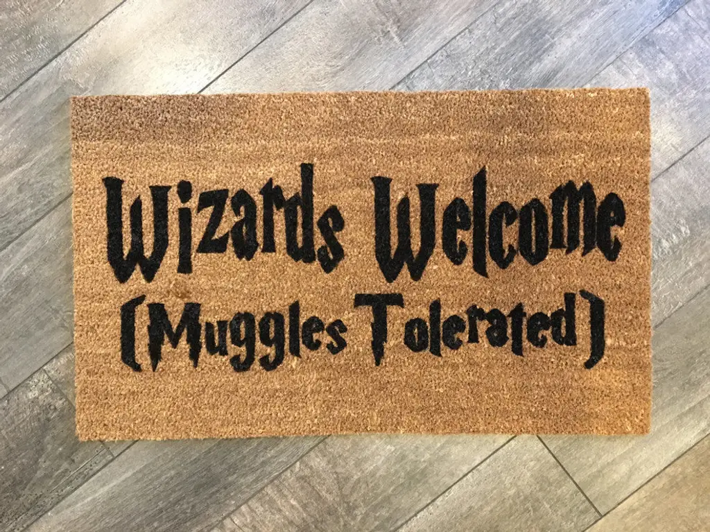 Our Wizards Welcome doormat is the perfect way to create an inviting and beautiful entry way! Our welcome mats are hand- painted and each design is available in a wide variety of colors. Shown in Black Soul. Dark colors highly recommended and show best on the rough surface of the mats.- All of our mats are tan/natural brown in color. The natural coir fibers of the doormat are from the husk of the coconut which is mold and mildew resistant and have an extra- sturdy, thick vinyl backing to ensure they wont slide around, no matter the surface. Though we use all- weather paints and a UV sealant to ensure that your mat is perfect for your doorstep, we suggest that you keep your mat as dry as possible to avoid darkening of the fibers. To clean, simply shake out...easy as that! - This product is made to order. We do our best to process and ship standard orders as quickly as possible. Please observe lead times. - Color Options: Black Soul, Bleeding Heart , Cherry Lips , Troubled Times Gray, Pretty in Pink, Mr. Jones Orange, Min. Mustard Yellow, Popcorn Light Yellow, Daphne Dill Green, Lucky Charm Green, Kelly Green, Amazon Dark Green, Little Boy Blue, Bfast at Tiffany Blue, Sophie Sky Blue, Pacific Blue, Midnight Dark Blue, CA Bear Brown, Jelly Dark Purple