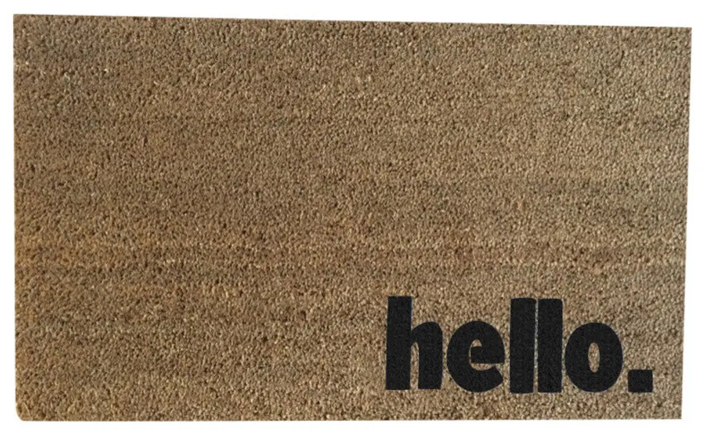 Our hello. doormat is the perfect way to create an inviting and clever entry way! Our welcome mats are hand- painted and each design is available in several colors.- All of our mats are tan/natural brown in color. The natural coir fibers of the doormat are from the husk of the coconut which is mold and mildew resistant and have an extra- sturdy, thick vinyl backing to ensure they wont slide around, no matter the surface. Though we use all- weather paints and a UV sealant to ensure that your mat is perfect for your doorstep, we suggest that you keep your mat as dry as possible to avoid darkening of the fibers. To clean, simply shake out...easy as that! - This product is made to order. We do our best to process and ship standard orders as quickly as possible. Please observe lead times. - Color Options: Black Soul, Troubled Times Gray, Bleeding Heart, Cherry Lips, Pretty in Pink, Mr. Jones Orange, Mustard Yellow, Popcorn Light Yellow, Daphne Dill Green, Lucky Charm Green, Kelly Green, Amazon Dark Green, Little Boy Blue, Breakfast at Tiffany Blue, Sophie Sky Blue, Pacific Blue, Midnight Dark Blue, Jelly Dark Purple, CA Bear Brown