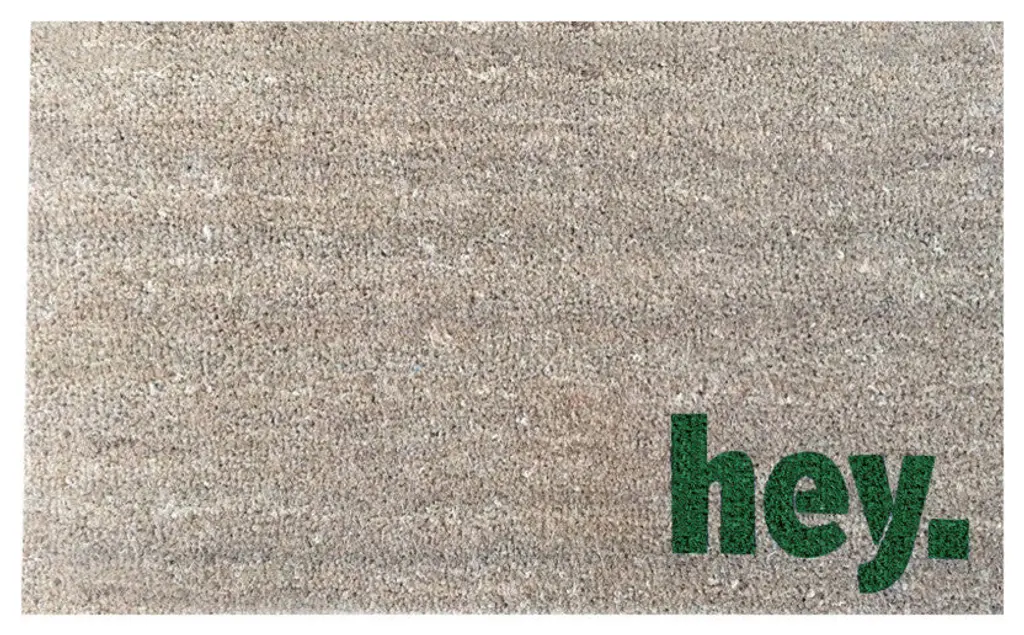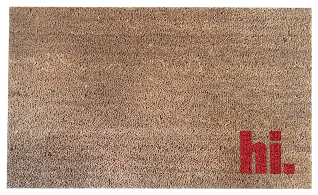 Our "hi." doormat is the perfect way to create an inviting and clever entry way! Our welcome mats are hand- painted and each design is available in a wide variety of colors. - All of our mats are tan/natural brown in color. The natural coir fibers of the doormat are from the husk of the coconut which is mold and mildew resistant and have an extra- sturdy, thick vinyl backing to ensure they wont slide around, no matter the surface. Though we use all- weather paints and a UV sealant to ensure that your mat is perfect for your doorstep, we suggest that you keep your mat as dry as possible to avoid darkening of the fibers. To clean, simply shake out...easy as that!- Please view secondary image for swatch.