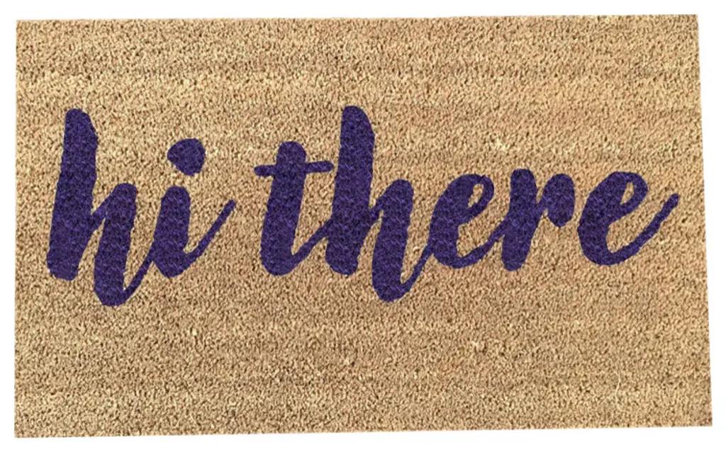 Our "hi there" doormat is the perfect way to create an inviting and trendy entry way! Our welcome mats are hand- painted and each design is available in a wide variety of colors. - All of our mats are 18"x30" and tan/natural brown in color. The natural coir fibers of the doormat are from the husk of the coconut which is mold and mildew resistant and have an extra- sturdy, thick vinyl backing to ensure they wont slide around, no matter the surface. Though we use all- weather paints and a UV sealant to ensure that your mat is perfect for your doorstep, we suggest that you keep your mat as dry as possible to avoid darkening of the fibers. To clean, simply shake out...easy as that! - Please view secondary image for swatch.