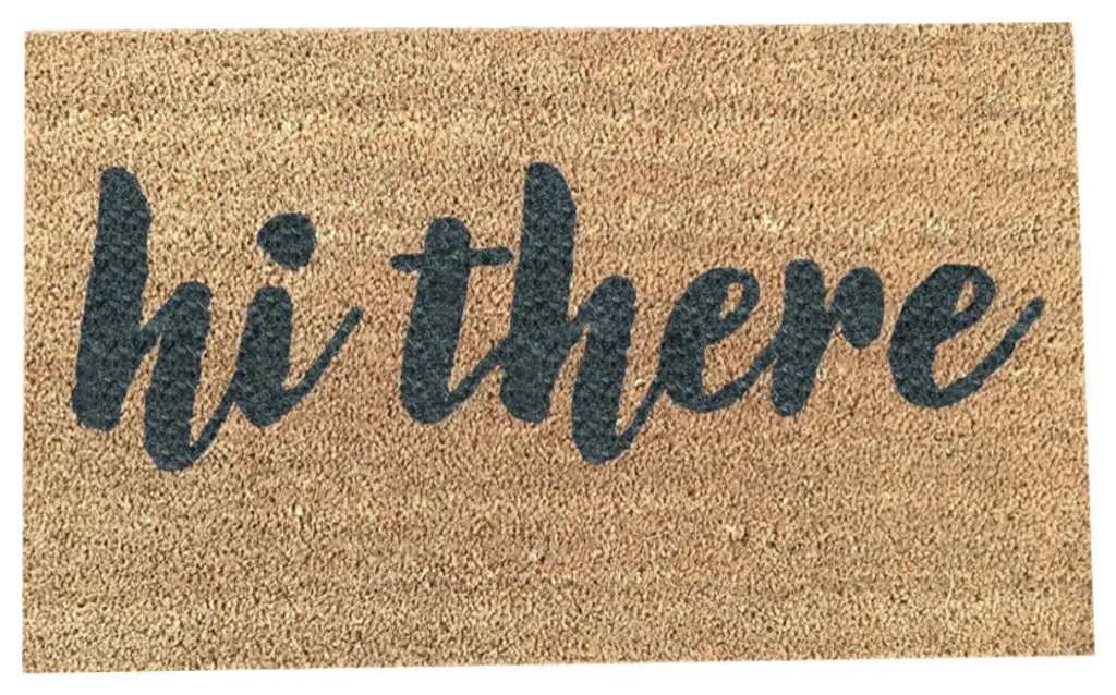 Our "hi there" doormat is the perfect way to create an inviting and trendy entry way! Our welcome mats are hand- painted and each design is available in a wide variety of colors. - All of our mats are 18"x30" and tan/natural brown in color. The natural coir fibers of the doormat are from the husk of the coconut which is mold and mildew resistant and have an extra- sturdy, thick vinyl backing to ensure they wont slide around, no matter the surface. Though we use all- weather paints and a UV sealant to ensure that your mat is perfect for your doorstep, we suggest that you keep your mat as dry as possible to avoid darkening of the fibers. To clean, simply shake out...easy as that! - Please view secondary image for swatch.