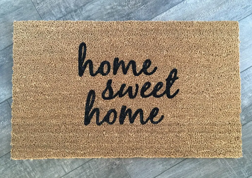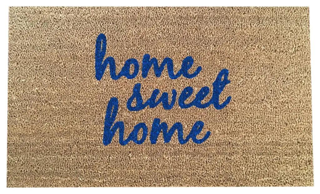 Our Home Sweet Home'' doormat is the perfect way to create an inviting and sweet entry way! Our welcome mats are hand- painted with care to ensure your guests are greeted with a cute greeting! - All of our mats are tan/natural brown in color. The natural coir fibers of the doormat are from the husk of the coconut which is mold and mildew resistant and have an extra- sturdy, thick vinyl backing to ensure they wont slide around, no matter the surface. Though we use all- weather paints and a UV sealant to ensure that your mat is perfect for your doorstep, we suggest that you keep your mat as dry as possible to avoid darkening of the fibers. To clean, simply shake out...easy as that! - This product is made to order. We do our best to process and ship standard orders as quickly as possible. Please observe lead times. - Color Options: Black Soul, Troubled Times Gray, Bleeding Heart Red, Cherry Lips Red, Pretty in Pink, Mr. Jones Orange, Mustard Yellow, Popcorn Yellow, Daphne Dill Green, Lucky Charm Green, Kelly Green, Amazon Dark Green, Little Boy Blue, Breakfast at Tiffany Blue, Sophie Sky Blue, Pacific Blue, Midnight Dark Blue, Jelly Dk. Purple, CA Bear Brown