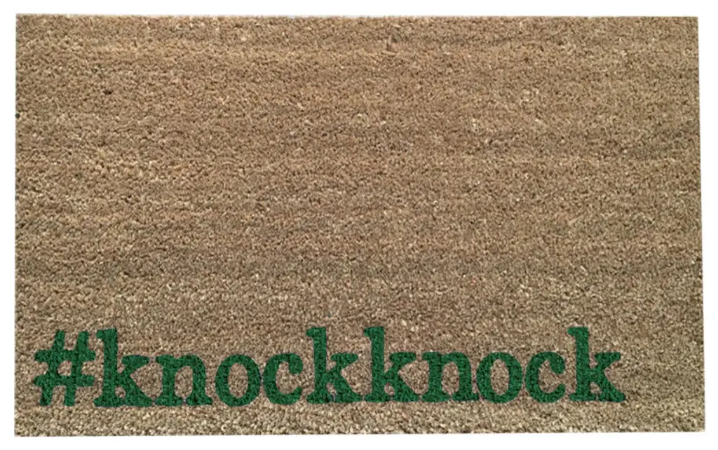 Our #knockknock doormat is a clever way to create an inviting and "trending" entry way! Our welcome mats are hand- painted and each design is available in a wide variety of colors.- All of our mats are 18"x30" inches and tan/natural brown in color. The natural coir fibers of the doormat are from the husk of the coconut which is mold and mildew resistant and have an extra- sturdy, thick vinyl backing to ensure they wont slide around, no matter the surface. Though we use all- weather paints and a UV sealant to ensure that your mat is perfect for your doorstep, we suggest that you keep your mat as dry as possible to avoid darkening of the fibers. To clean, simply shake out...easy as that! - This product is made to order. We do our best to process and ship standard orders as quickly as possible. Please observe lead times. - Color Options: Bleeding Heart Red, Cherry Lips, Pretty in Pink, Mr. Jones Orange, Mustard Yellow, Lucky Charm Green, Kelly Green, Amazon Dark Green, Sophie Sky Blue, Pacific Blue, Midnight Navy Blue, Jelly Purple, CA Bear Brown, Black Soul, Troubled Times Gray