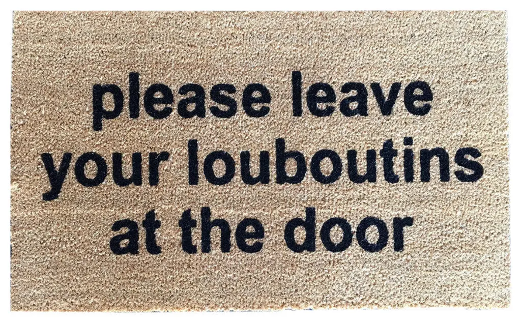Our leave your Louboutins doormat is the perfect way to create an inviting and clever entry way! Our welcome mats are hand- painted and each design is available in a wide variety of colors. - All of our mats are tan/natural brown in color. The natural coir fibers of the doormat are from the husk of the coconut which is mold and mildew resistant and have an extra- sturdy, thick vinyl backing to ensure they wont slide around, no matter the surface. Though we use all- weather paints and a UV sealant to ensure that your mat is perfect for your doorstep, we suggest that you keep your mat as dry as possible to avoid darkening of the fibers. To clean, simply shake out...easy as that! - Please view secondary image for swatch.