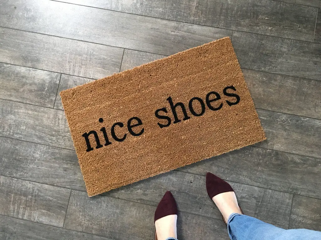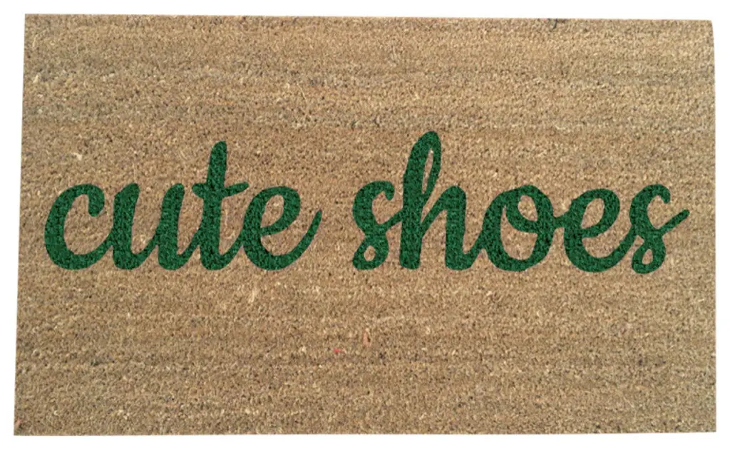 Our nice shoes doormat is the perfect way to create an inviting and clever entry way! Our welcome mats are hand- painted and each design is available in a wide variety of colors. - All of our mats are tan/natural brown in color. The natural coir fibers of the doormat are from the husk of the coconut which is mold and mildew resistant and have an extra- sturdy, thick vinyl backing to ensure they wont slide around, no matter the surface. Though we use all- weather paints and a UV sealant to ensure that your mat is perfect for your doorstep, we suggest that you keep your mat as dry as possible to avoid darkening of the fibers. To clean, simply shake out...easy as that! - This product is made to order. We do our best to process and ship standard orders as quickly as possible. Please observe lead times. - Color Options: Black Soul, Troubled Times Gray, Bleeding Heart, Cherry Lips, Pretty in Pink, Mr. Jones Orange, Kelly Green, Amazon Dark Green, Sophie Sky Blue, Pacific Blue, Midnight Dark Blue, Jelly Dark Purple, CA Bear Brown