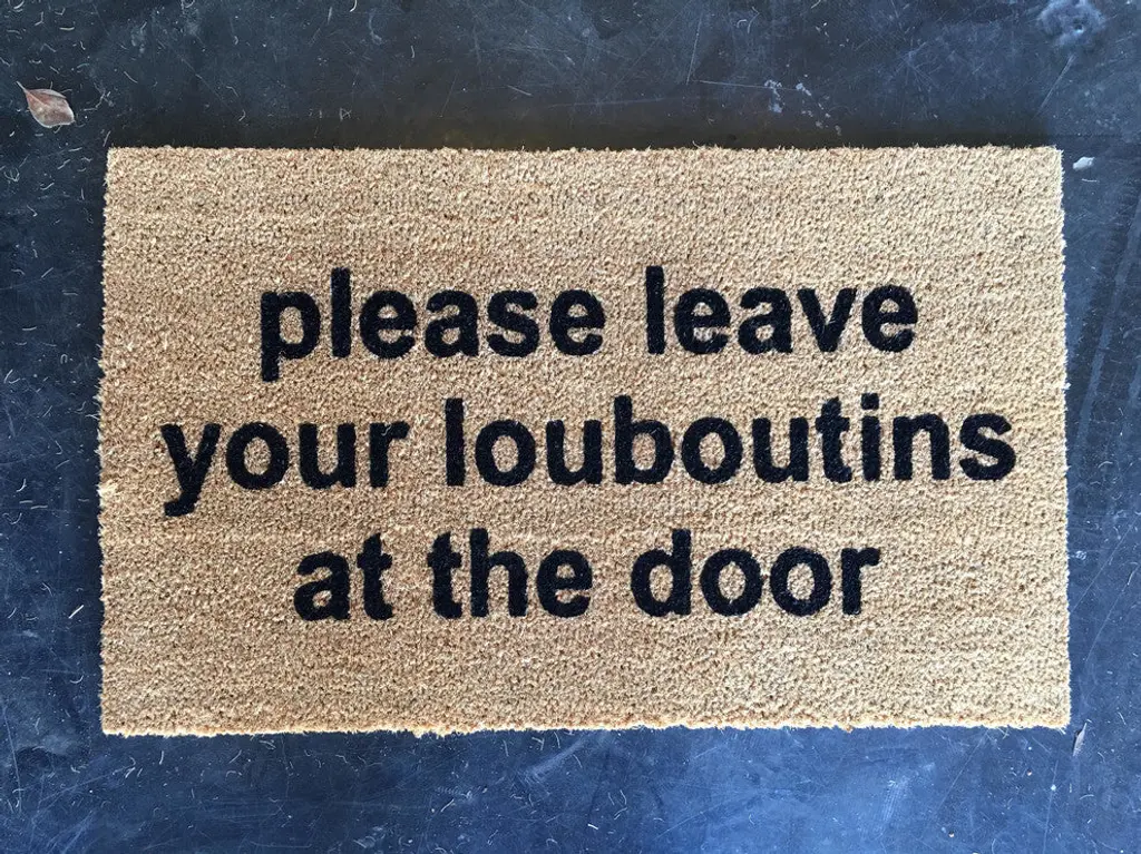 Our nice shoes doormat is the perfect way to create an inviting and clever entry way! Our welcome mats are hand- painted and each design is available in a wide variety of colors. - All of our mats are tan/natural brown in color. The natural coir fibers of the doormat are from the husk of the coconut which is mold and mildew resistant and have an extra- sturdy, thick vinyl backing to ensure they wont slide around, no matter the surface. Though we use all- weather paints and a UV sealant to ensure that your mat is perfect for your doorstep, we suggest that you keep your mat as dry as possible to avoid darkening of the fibers. To clean, simply shake out...easy as that! - This product is made to order. We do our best to process and ship standard orders as quickly as possible. Please observe lead times. - Color Options: Black Soul, Troubled Times Gray, Bleeding Heart, Cherry Lips, Pretty in Pink, Mr. Jones Orange, Kelly Green, Amazon Dark Green, Sophie Sky Blue, Pacific Blue, Midnight Dark Blue, Jelly Dark Purple, CA Bear Brown