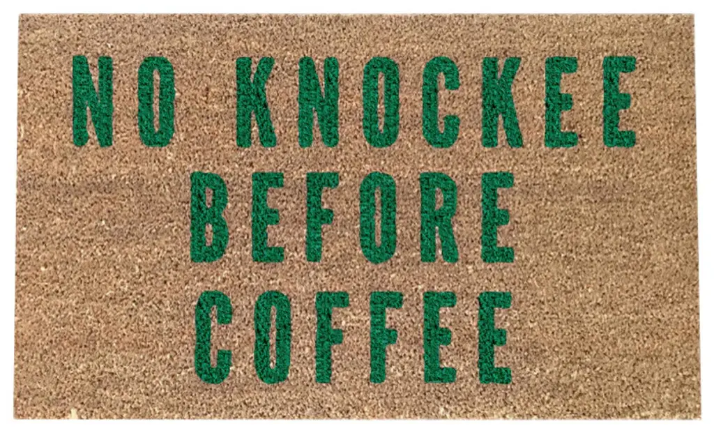 Our knockee and coffee'' doormat is the perfect way to create an inviting and charming entry way! All of our welcome mats are hand- painted and each design is available in a wide variety of colors. We strongly recommend using a bold or dark color for this style, as it shows up best on the rough surface of the mat. - All of our mats are tan/natural brown in color. The natural coir fibers of the doormat are from the husk of the coconut which is mold and mildew resistant and have an extra- sturdy, thick vinyl backing to ensure they wont slide around, no matter the surface. Though we use all- weather paints and a UV sealant to ensure that your mat is perfect for your doorstep, we suggest that you keep your mat as dry as possible to avoid darkening of the fibers. To clean, simply shake out...easy as that! - This product is made to order. We do our best to process and ship standard orders as quickly as possible. Please observe lead times. - Color Options: Bleeding Heart Red, Cherry Lips, Mr. Jones Orange, Kelly Green, Amazon Dark Green, Sophie Sky Blue, Pacific Blue, Midnight Navy Blue, Jelly Purple, CA Bear Brown, Troubled Times Gray, Black Soul