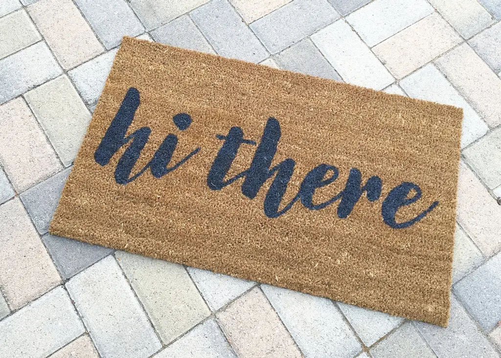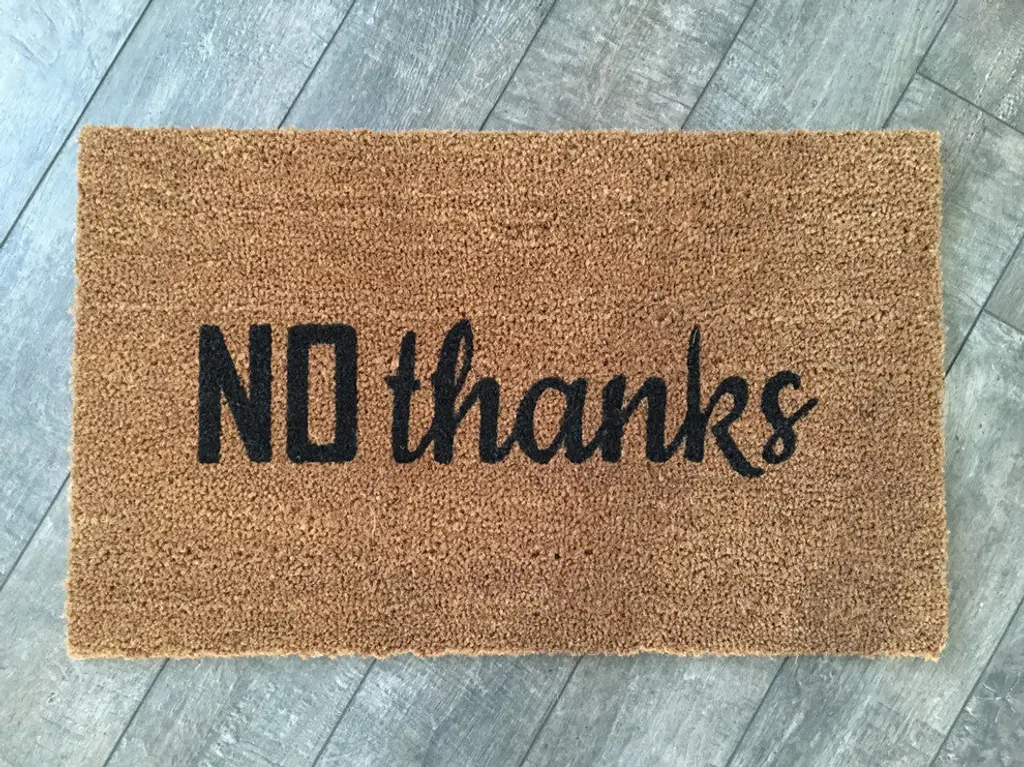 Our NO thanks. doormat is the perfect way to create a clever entry way! Our welcome mats are hand- painted and each design is available in several colors. Shown in ''Black Soul'' and available in several other colors. - All of our mats are tan/natural brown in color. The natural coir fibers of the doormat are from the husk of the coconut which is mold and mildew resistant and have an extra- sturdy, thick vinyl backing to ensure they wont slide around, no matter the surface. Though we use all- weather paints and a UV sealant to ensure that your mat is perfect for your doorstep, we suggest that you keep your mat as dry as possible to avoid darkening of the fibers. To clean, simply shake out...easy as that! - This product is made to order. We do our best to process and ship standard orders as quickly as possible. Please observe lead times. - Color Options: Black Soul, Troubled Times Gray, Bleeding Heart, Cherry Lips, Pretty in Pink, Mr. Jones Orange, Mustard Yellow, Popcorn Yellow, Daphne Dill Green, Lucky Charm Green, Kelly Green, Amazon Dark Green, Little Boy Blue, Breakfast at Tiffany Blue, Sophie Sky Blue, Pacific Blue, Midnight Dark Blue, Jelly Dark Purple, CA Bear Brown