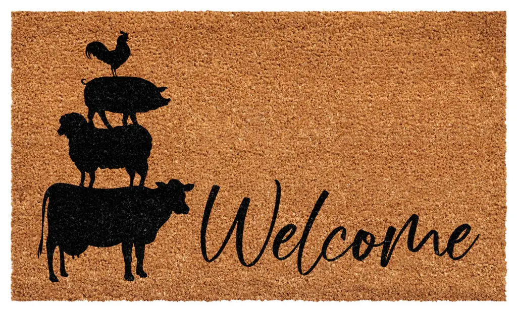 Our ''Bring Home the Bacon'' doormat is the perfect way to create an inviting and trendy entry way! Our welcome mats are hand- painted and each design is available in a wide variety of colors. - All of our mats are tan/natural brown in color. The natural coir fibers of the doormat are from the husk of the coconut which is mold and mildew resistant and have an extra- sturdy, thick vinyl backing to ensure they wont slide around, no matter the surface. Though we use all- weather paints and a UV sealant to ensure that your mat is perfect for your doorstep, we suggest that you keep your mat as dry as possible to avoid darkening of the fibers. To clean, simply shake out...easy as that! - This product is made to order. We do our best to process and ship standard orders as quickly as possible. Please observe lead times. - Color Options: Black Soul, Troubled Times Gray, Bleeding Heart, Cherry Lips, Pretty in Pink, Mr. Jones Orange, Mustard Yellow, Popcorn Yellow, Daphne Dill Green, Lucky Charm Green, Kelly Green, Amazon Dark Green, Little Boy Blue, Breakfast at Tiffany Blue, Sophie Sky Blue, Pacific Blue, Midnight Dark Blue, Jelly Dark Purple, CA Bear Brown