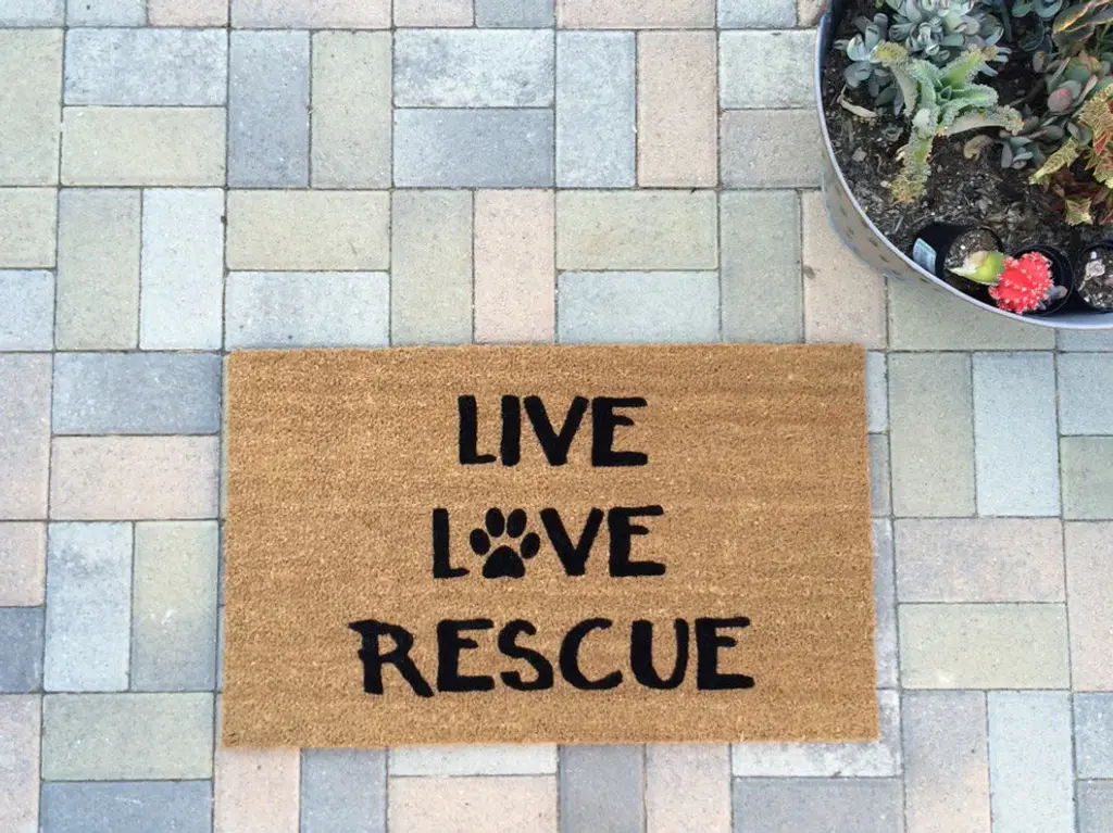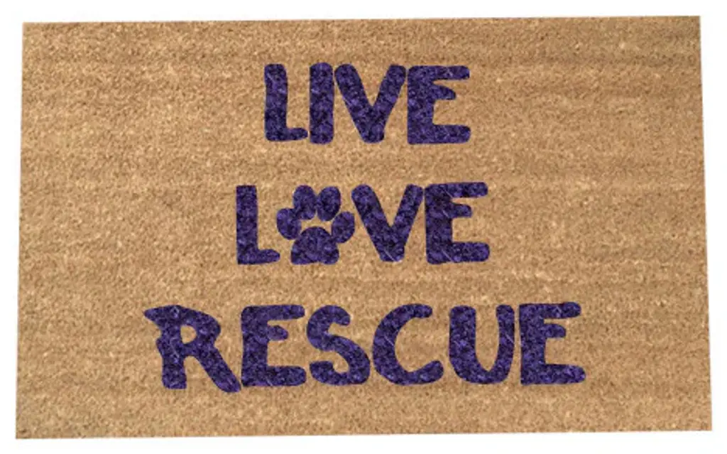 Rescue Dog / Cat welcome mat. This hand painted doormat shows that you support animal rescue efforts! $5.00 donation for each sale!- Our ''Live Love Rescue'' doormat is the perfect way to share your love of animals! $5.00 will be donated to animal rescues for each ''Live Love Rescue'' doormat sold!! Our welcome mats are hand- painted and each design is available in a wide variety of colors. - All of our mats are tan/natural brown in color. The natural coir fibers of the doormat are from the husk of the coconut which is mold and mildew resistant and have an extra- sturdy, thick vinyl backing to ensure they wont slide around, no matter the surface. Though we use all- weather paints and a UV sealant to ensure that your mat is perfect for your doorstep, we suggest that you keep your mat as dry as possible to avoid darkening of the fibers. To clean, simply shake out...easy as that! - This product is made to order. We do our best to process and ship standard orders as quickly as possible. Please observe lead times. - Color Options: Black Soul, Troubled Times Gray, Bleeding Heart, Cherry Lips, Pretty in Pink, Mr. Jones Orange, Min. Mustard Yellow, Daphne Dill Green, Lucky Charm Green, Kelly Green, Amazon Dark Green, Little Boy Blue, Bfast at Tiffany Blue, Sophie Sky Blue, Pacific Blue, Midnight Dark Blue, CA Bear Brown, Jelly Dark Purple