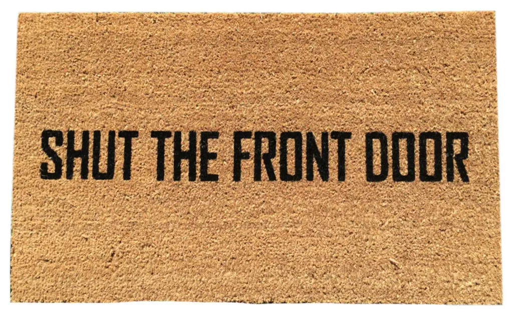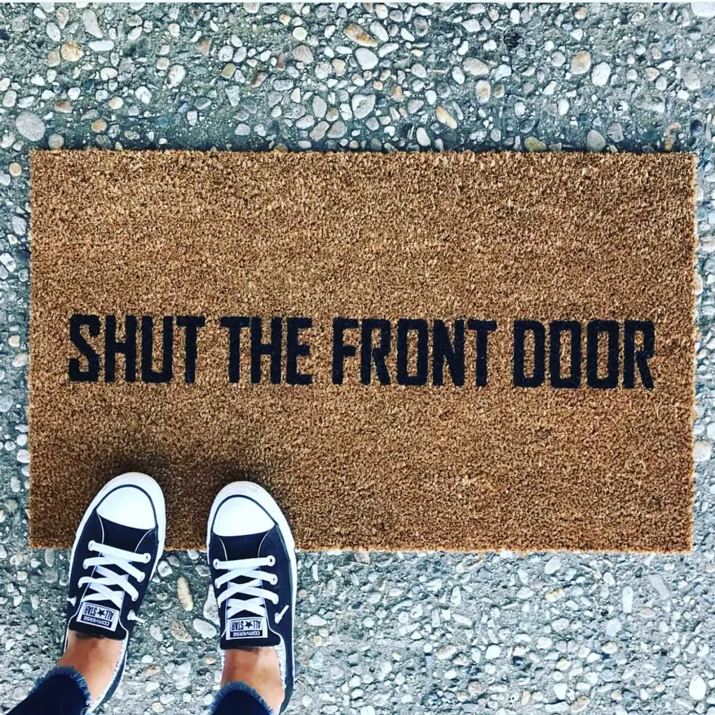 Our "Shut the Front Door!" doormat is the perfect way to convey your style and humor to your guests! Our welcome mats are hand-painted and each design is available in a wide variety of colors.All of our mats are tan/natural brown in color. The natural coir fibers of the doormat are from the husk of the coconut which is mold and mildew resistant and have an extra-sturdy, thick vinyl backing to ensure they won''t slide around, no matter the surface. Though we use all-weather paints and a UV sealant to ensure that your mat is perfect for your doorstep, we suggest that you keep your mat as dry as possible to avoid darkening of the fibers. To clean, simply shake out - easy as that!Please observe lead times as all our products are made to order.