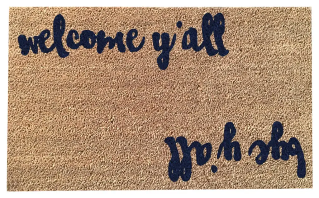 Our welcome y''all / bye y''all '' doormat is the perfect way to create an inviting and clever entry way! Our welcome mats are hand- painted and each design is available in a wide variety of colors. We highly recommend a dark /bold color.- All of our mats are tan/natural brown in color. The natural coir fibers of the doormat are from the husk of the coconut which is mold and mildew resistant and have an extra- sturdy, thick vinyl backing to ensure they wont slide around, no matter the surface. Though we use all- weather paints and a UV sealant to ensure that your mat is perfect for your doorstep, we suggest that you keep your mat as dry as possible to avoid darkening of the fibers. To clean, simply shake out...easy as that! - This product is made to order. We do our best to process and ship standard orders as quickly as possible. Please observe lead times. - Color Options: Black Soul, Troubled Times Gray, Bleeding Heart, Cherry Lips, Pretty in Pink, Mr. Jones Orange, Mustard Yellow, Lucky Charm Green, Kelly Green, Amazon Dark Green, Breakfast at Tiffany Blue, Sophie Sky Blue, Pacific Blue, Midnight Dark Blue, Jelly Dark Purple, CA Bear Brown
