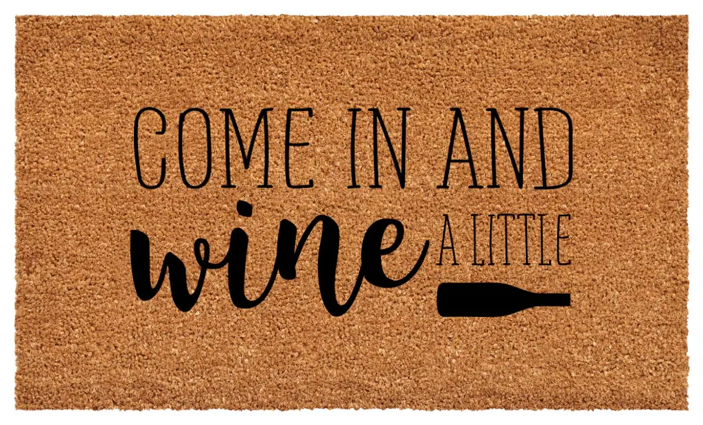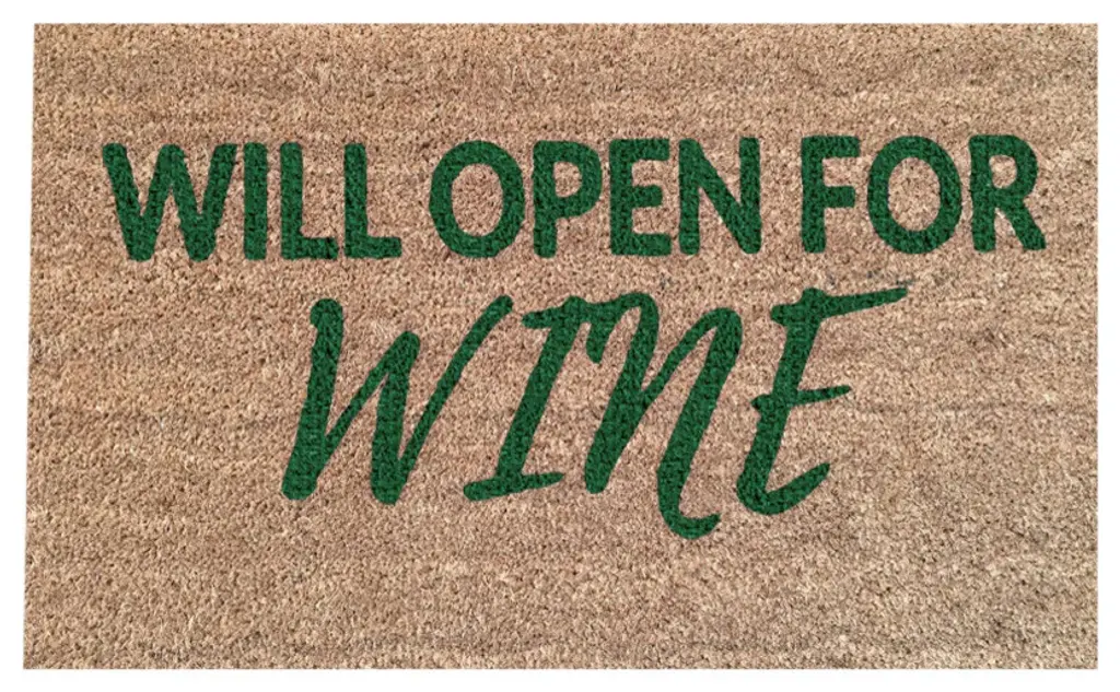 Our "Will Open For Wine" doormat is the perfect way to create an inviting and trendy entry way! Our welcome mats are hand-painted and each design is available in a wide variety of colors.All of our mats are tan/natural brown in color. The natural coir fibers of the doormat are from the husk of the coconut which is mold and mildew resistant and have an extra-sturdy, thick vinyl backing to ensure they won''t slide around, no matter the surface. Though we use all-weather paints and a UV sealant to ensure that your mat is perfect for your doorstep, we suggest that you keep your mat as dry as possible to avoid darkening of the fibers. To clean, simply shake out - easy as that!Please observe lead times as all our products are made to order.
