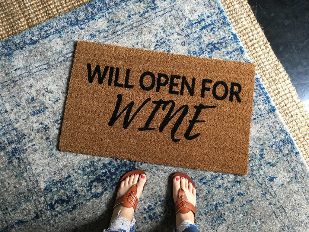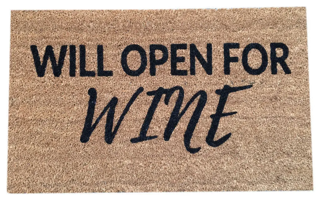 Our "Will Open For Wine" doormat is the perfect way to create an inviting and trendy entry way! Our welcome mats are hand-painted and each design is available in a wide variety of colors.All of our mats are tan/natural brown in color. The natural coir fibers of the doormat are from the husk of the coconut which is mold and mildew resistant and have an extra-sturdy, thick vinyl backing to ensure they won''t slide around, no matter the surface. Though we use all-weather paints and a UV sealant to ensure that your mat is perfect for your doorstep, we suggest that you keep your mat as dry as possible to avoid darkening of the fibers. To clean, simply shake out - easy as that!Please observe lead times as all our products are made to order.