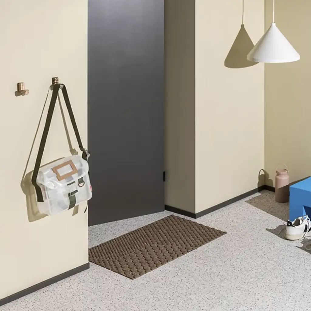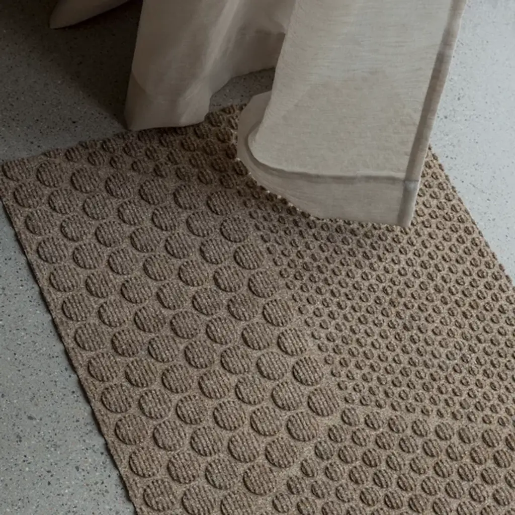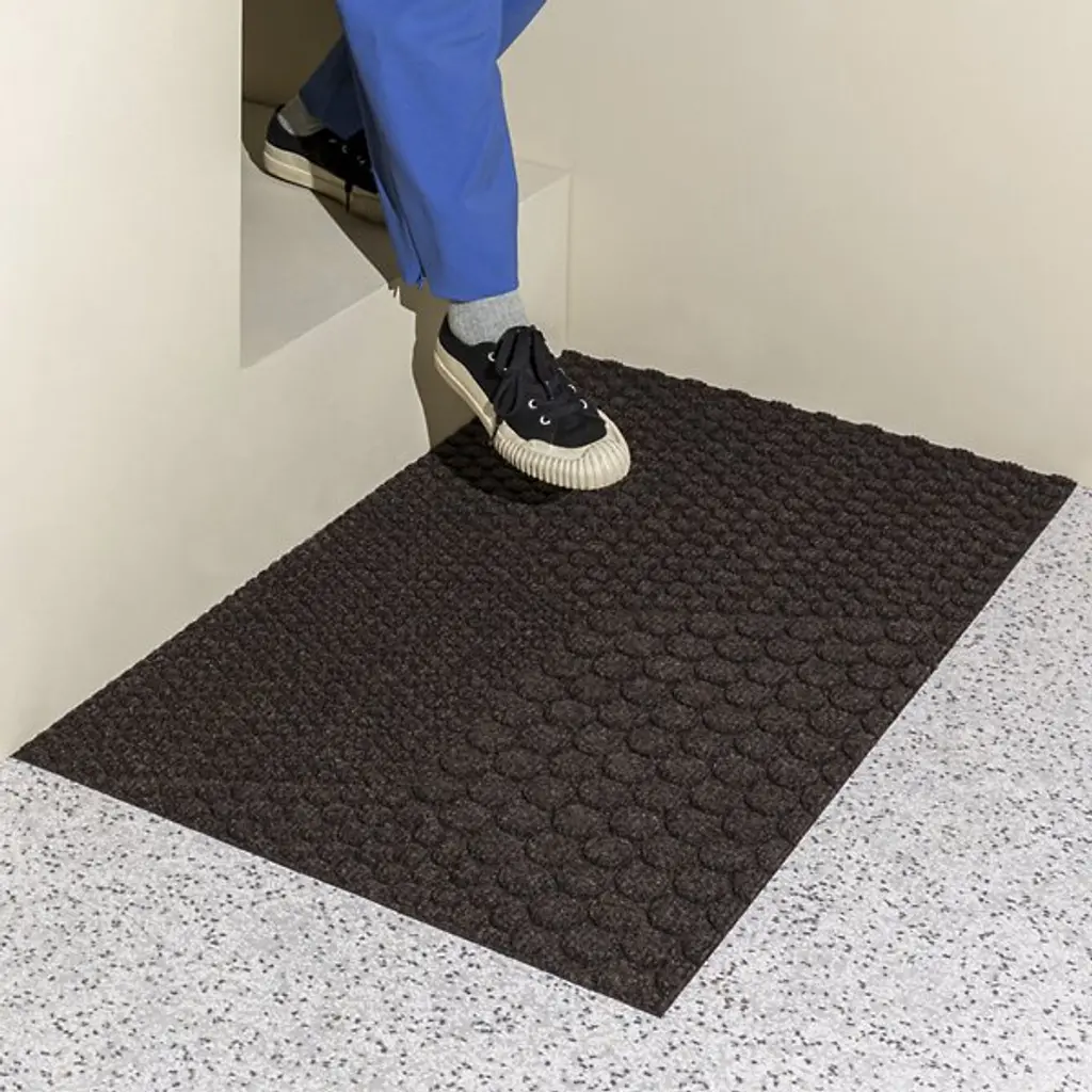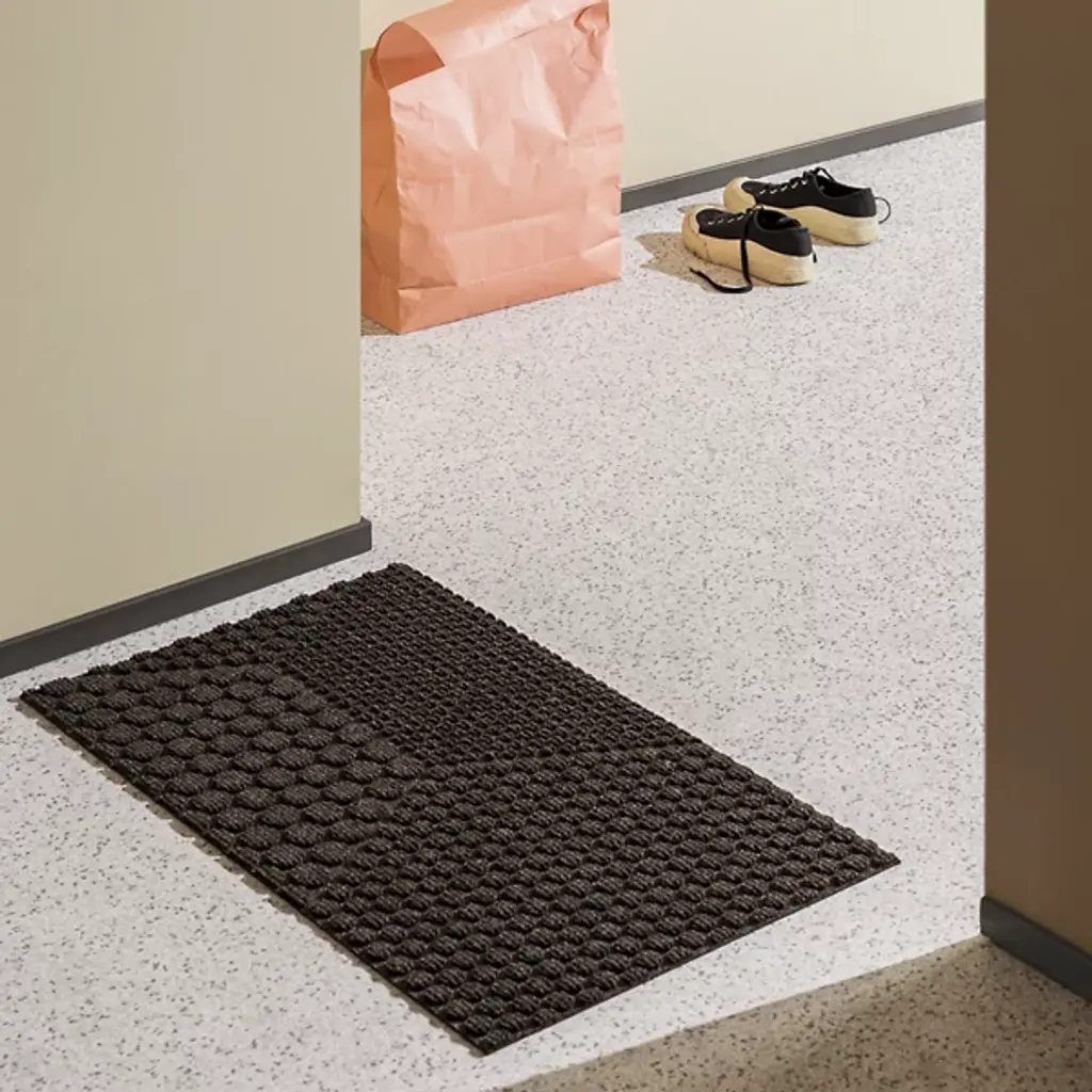 Gorgeous geometry defines the contemporary Hex Doormat by Heymat. Designed by Vera & Kyte, it uses repeating rounded discs to compose polygonal shapes in graphic patterns underfoot, catching dirt in angular intersections. An anti-slip rubber backing helps the mat stay firmly in place indoors or out, while its polypropylene constitution and entrancing texture provide a stylish first impression at thresholds.
