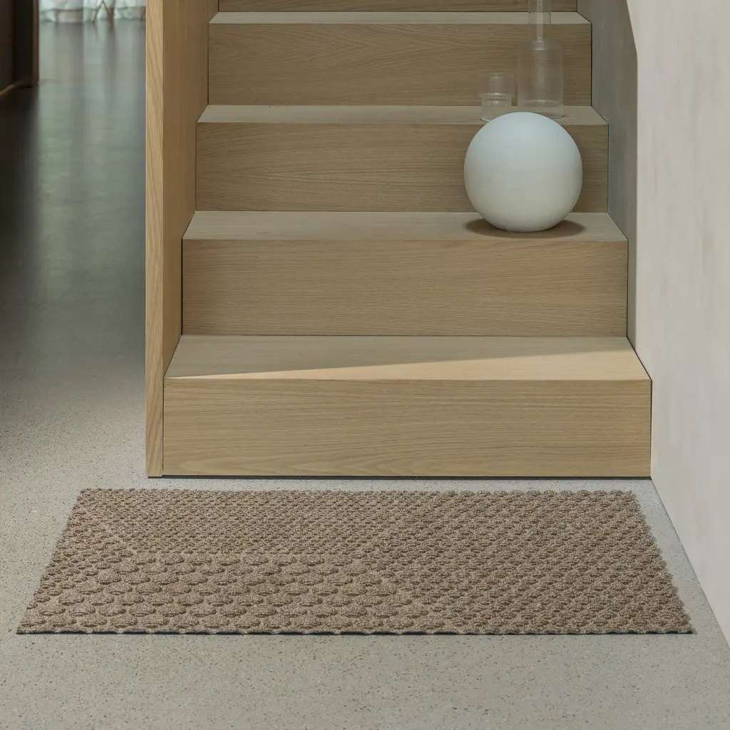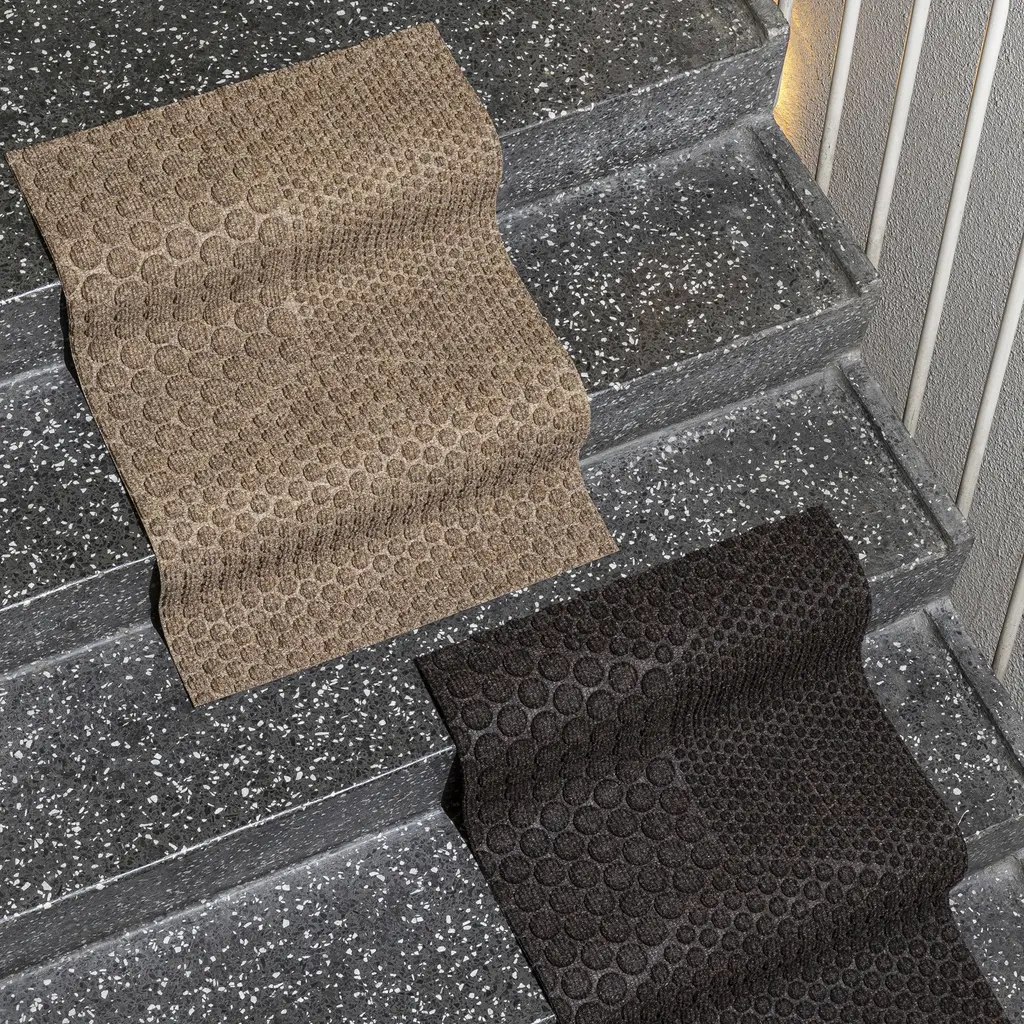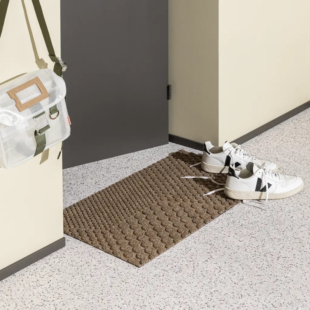 Inspired by architecture and industrial design, the Hex series from Heymat features a play between geometric patterns. Designer Lars Tornøe created the collection with circles that create hexagon shapes. The clearly organized patterns give a tranquil character to the design, while the neutral hues complement any existing color palettes. Like other Heymat products, the Hex doormats are made from recycled PET and PP, with a nitrile rubber backing that also contains up to 20% recycled content. Soft but durable, the textile layer absorbs moisture and helps trap dust and dirt. Apart from keeping this indoor entrance mat in place, the non-slip backing also prevents moisture from reaching the floor.
