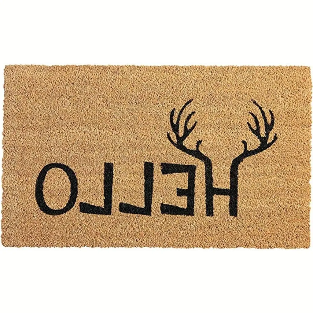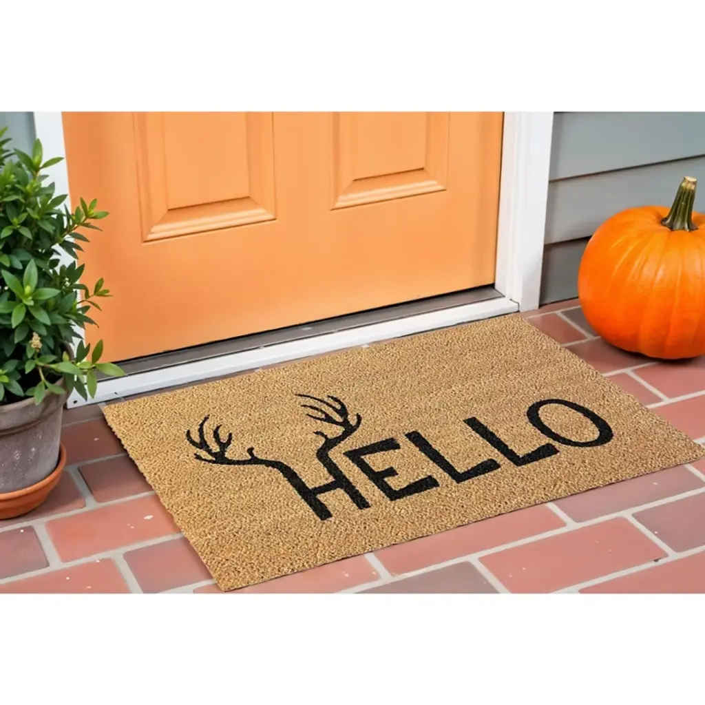 Known for it's extreme durability and ability to withstand heavy foot traffic, this 17-inch x 29-inch natural and black hello with antlers coir outdoor door mat is an ideal option for the front door or entrance way of your home or business. Crafted from coconut husks, this mat is not only functional but is an an eco-friendly and visually appealing accessory. The naturally bristled texture of coir is an efficient way to clean dirt and mud from shoes and is easy to clean and maintain. Add this decorative mat to create a practical yet inviting welcome to all who enter. 17-inch h x 29-inch w x 0.6-inch d.