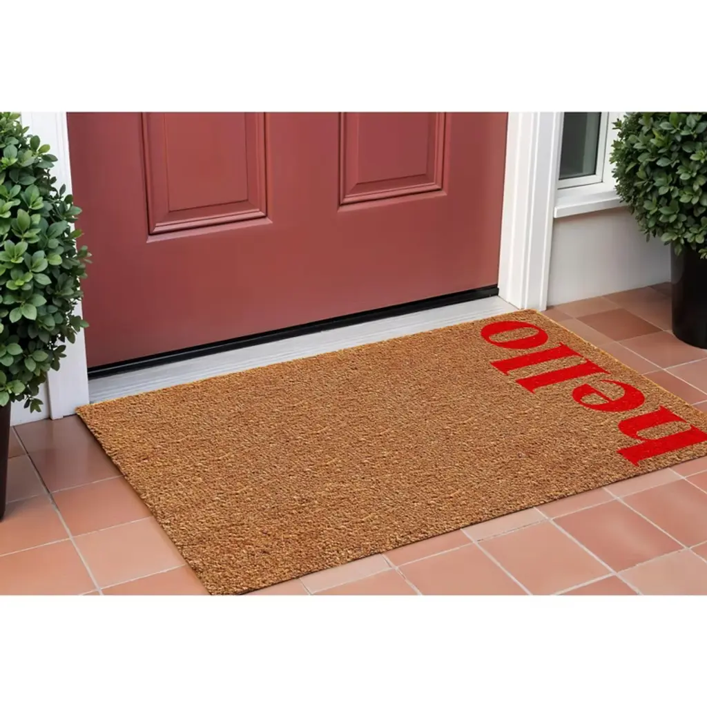 Homeroots 17" X 29" Natural And Red Hello Outdoor Coir Door Mat