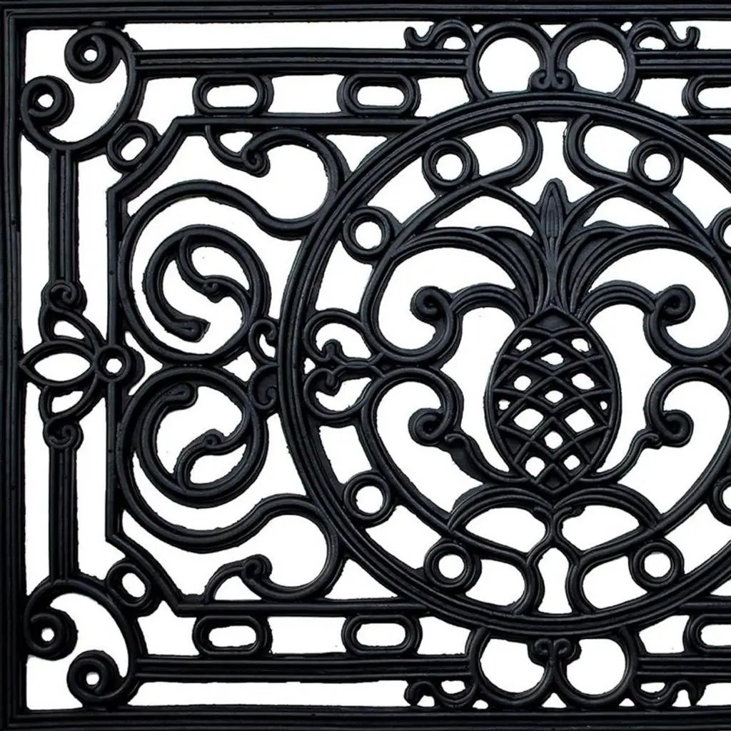 Ready to withstand heavy foot traffic, this 24-inch x 36-inch black pineapple and scrollwork outdoor rubber door mat is an ideal option for the front door or entrance way of your home or business. Crafted from rubber, this mat is not only functional but is a visually appealing accessory to welcome people to your home or business. Add this decorative mat to create a practical yet inviting welcome to all who enter. 24-inch h x 36-inch w x 0.4-inch d.