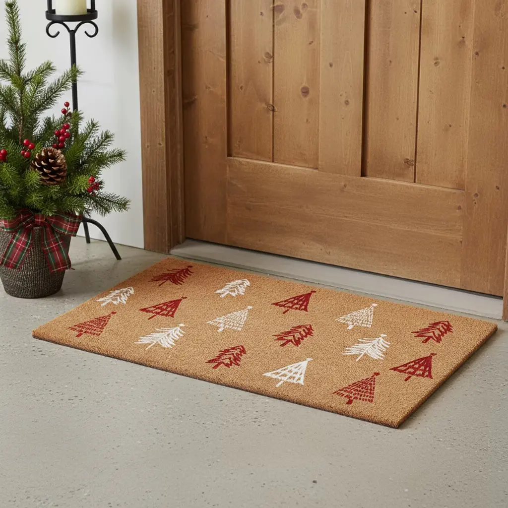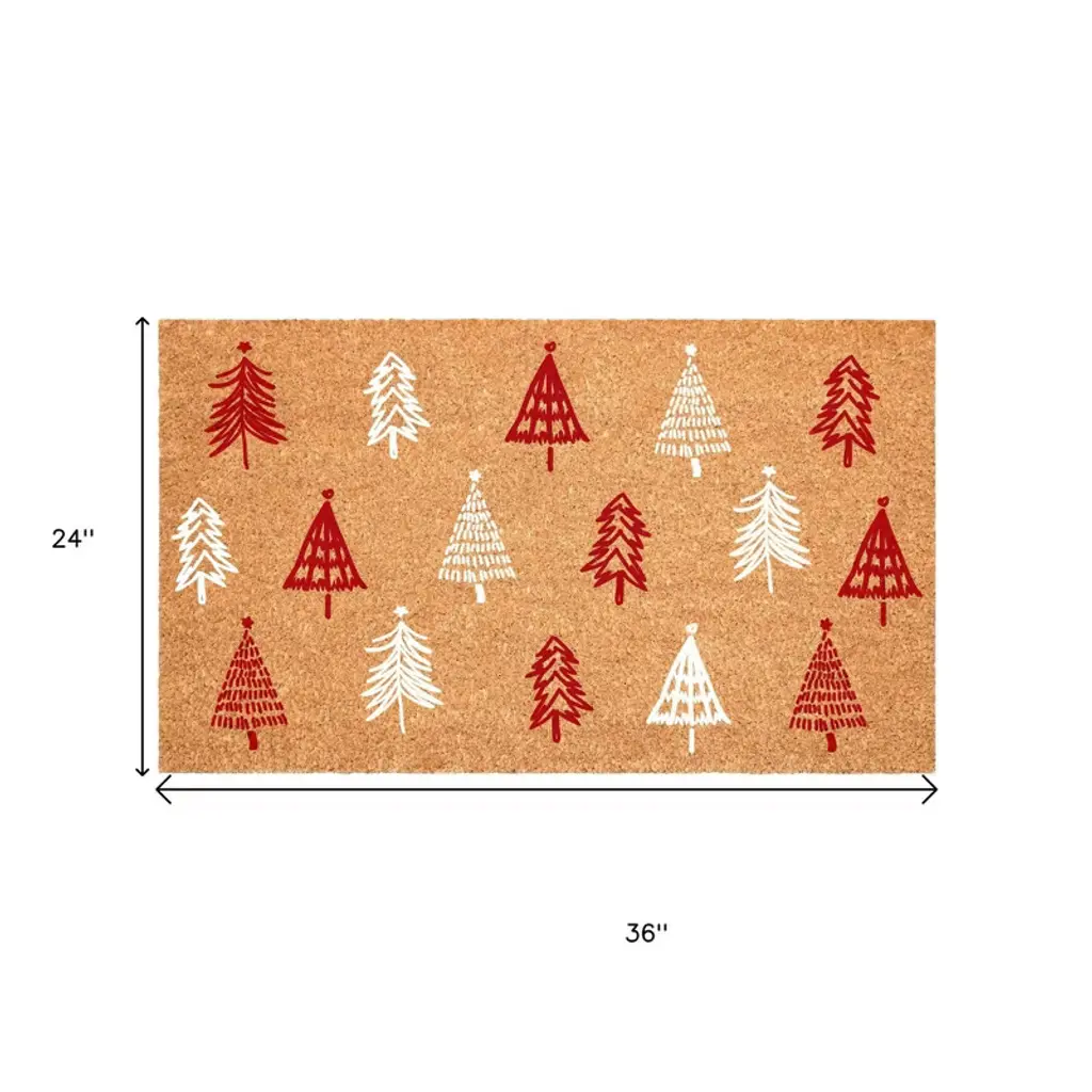 Homeroots 24" X 36" Brown Red And White Christmas Trees Outdoor Coir Door Mat
