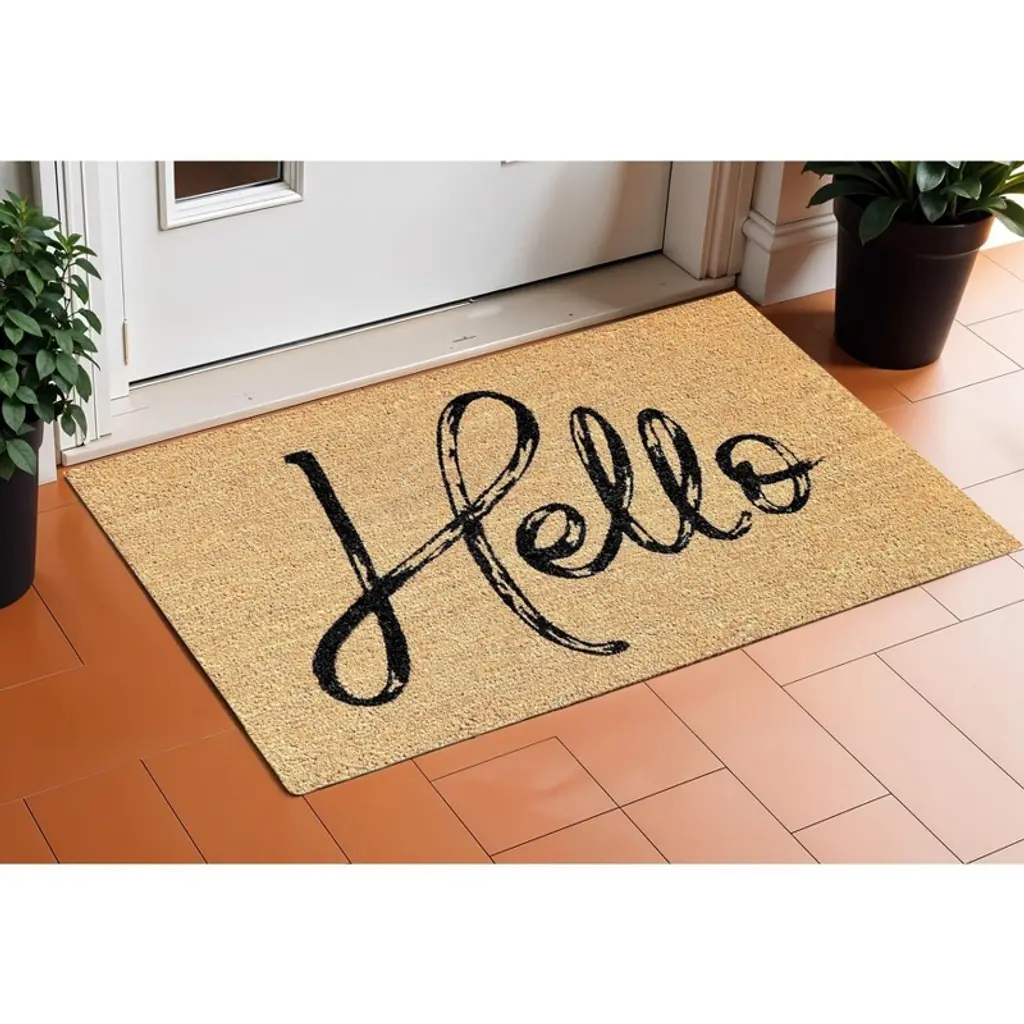 Homeroots 24" X 36" Natural And Black Hello Distressed Outdoor Coir Door Mat