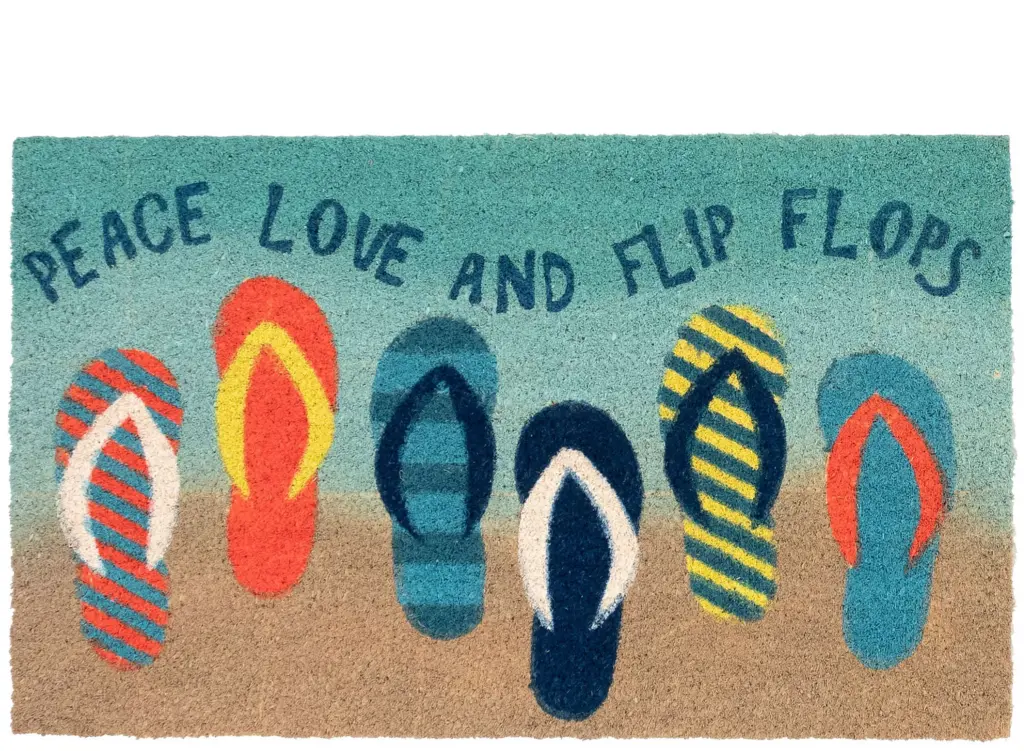 Our Flip Flops mat will add a fun, coastal vibe to your doorstep. This coir utility mat is both stylish and practical, in blue. Natura coir doormats are durable and beautiful. Crafted from 100% coir which is an all-natural material known for its strength. Coir is eco-friendly, made from natural fibers which are extracted from the outer shell of a coconut known for its strength and durability. Natura coir mats feature a durable vinyl back and a stiff, durable natural coir front perfect for wiping shoes before entering the home, keeping it tidy. They are available in a wide variety of designs ranging from classic and inspirational to nautical patterns. Dyes saturate the fibers for long-lasting color.