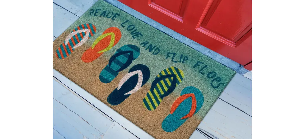 Our Flip Flops mat will add a fun, coastal vibe to your doorstep. This coir utility mat is both stylish and practical, in blue. Natura coir doormats are durable and beautiful. Crafted from 100% coir which is an all-natural material known for its strength. Coir is eco-friendly, made from natural fibers which are extracted from the outer shell of a coconut known for its strength and durability. Natura coir mats feature a durable vinyl back and a stiff, durable natural coir front perfect for wiping shoes before entering the home, keeping it tidy. They are available in a wide variety of designs ranging from classic and inspirational to nautical patterns. Dyes saturate the fibers for long-lasting color.