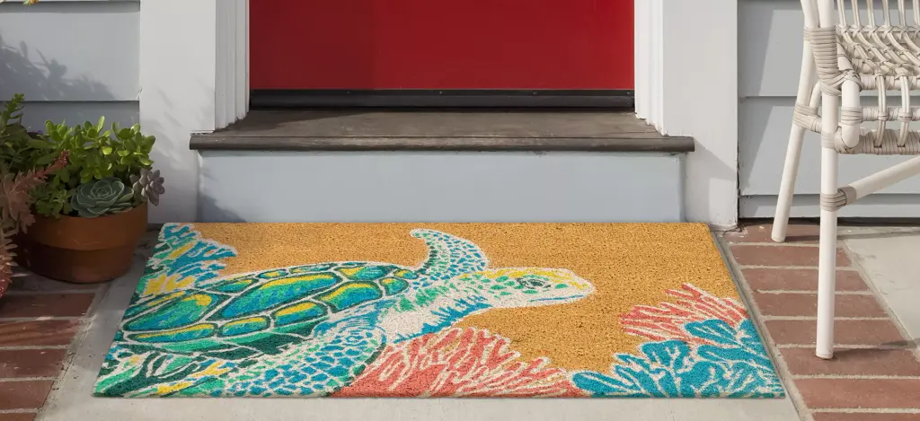Our Seaturtle mat will add a fun, coastal vibe to your doorstep. This coir utility mat is both stylish and practical, in natural. Natura coir doormats are durable and beautiful. Crafted from 100% coir which is an all-natural material known for its strength. Coir is eco-friendly, made from natural fibers which are extracted from the outer shell of a coconut known for its strength and durability. Natura coir mats feature a durable vinyl back and a stiff, durable natural coir front perfect for wiping shoes before entering the home, keeping it tidy. They are available in a wide variety of designs ranging from classic and inspirational to nautical patterns. Dyes saturate the fibers for long-lasting color.