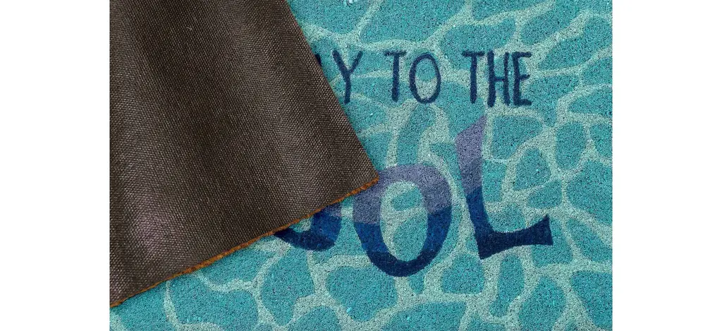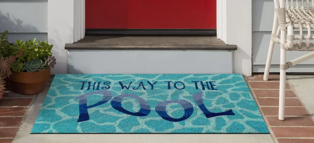 This Way To The Pool adds color and clear direction to any outdoor living space. This coir utility mat is both stylish and practical, in blue. Natura coir doormats are durable and beautiful. Crafted from 100% coir which is an all-natural material known for its strength. Coir is eco-friendly, made from natural fibers which are extracted from the outer shell of a coconut known for its strength and durability. Natura coir mats feature a durable vinyl back and a stiff, durable natural coir front perfect for wiping shoes before entering the home, keeping it tidy. They are available in a wide variety of designs ranging from classic and inspirational to nautical patterns. Dyes saturate the fibers for long-lasting color.
