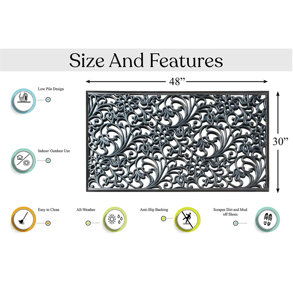 The beautiful combination of coir and rubber in this doormat make a stylish reception for your guests. While the heavy-duty rubber adds weight and elegance, the coir acts as a natural scraper on shoes to keep debris from entering your home. Sweep or hose clean.