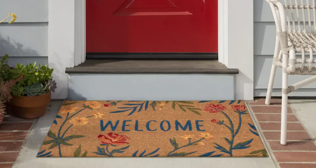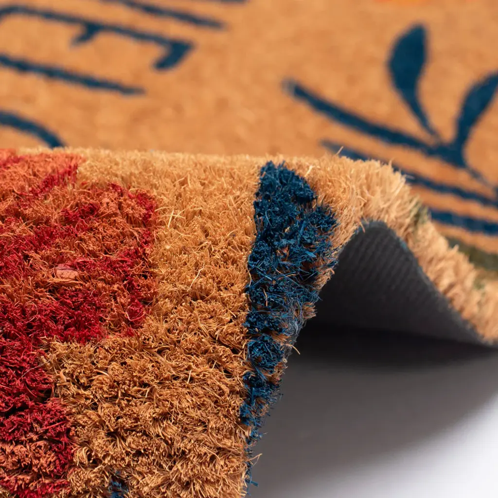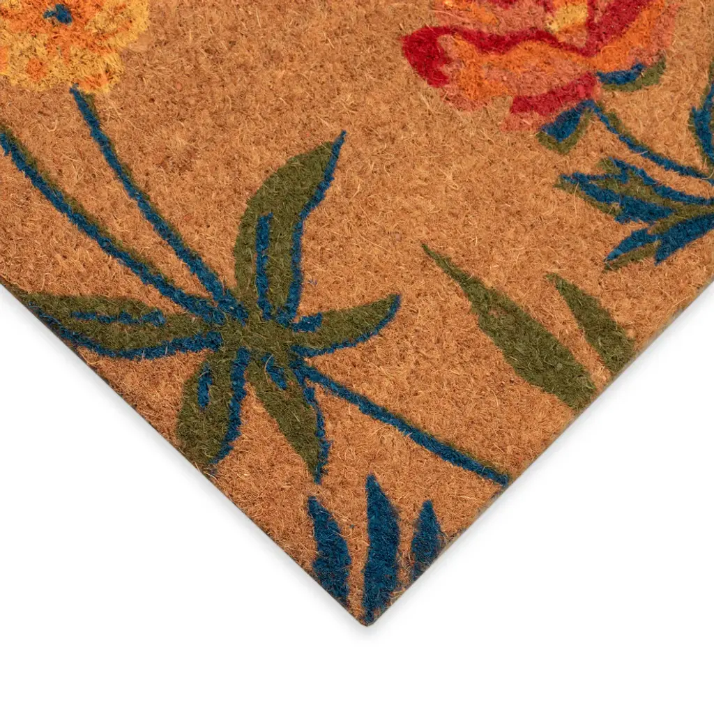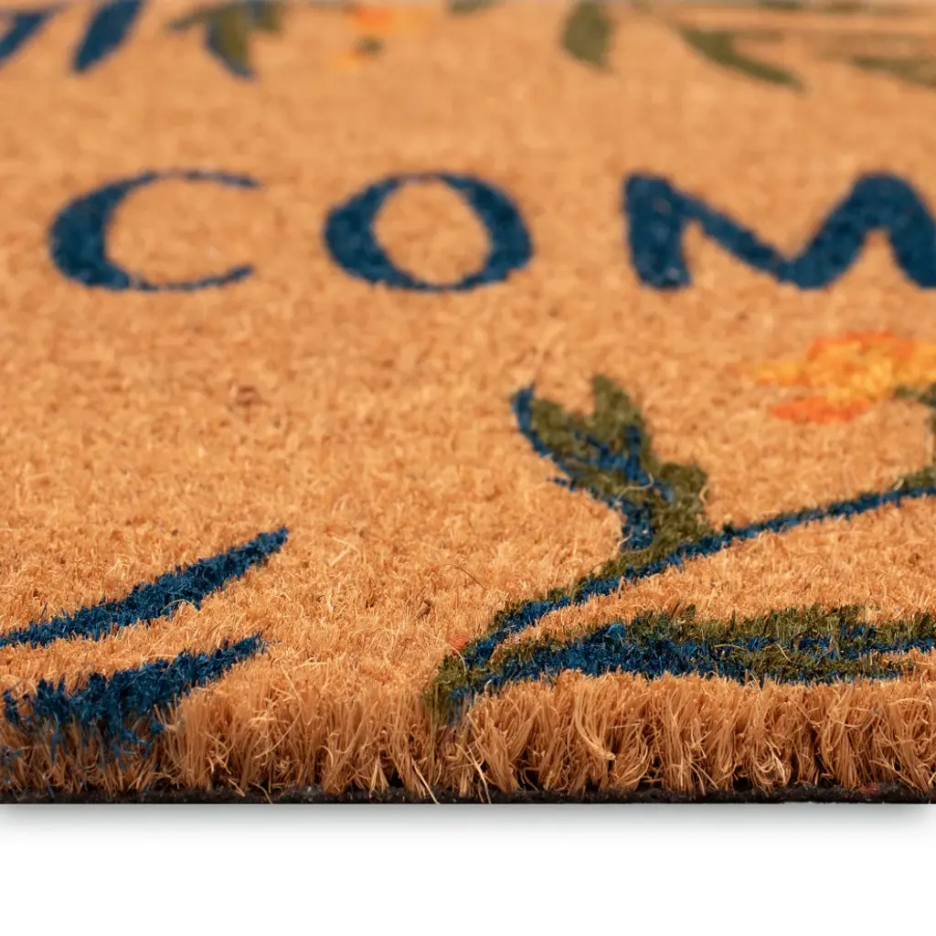 The Floral Welcome coir mat features whimsical red and yellow flowers with green leaves scattered around the edge creating a floral border design with a center welcome greeting written in blue on a natural background.
