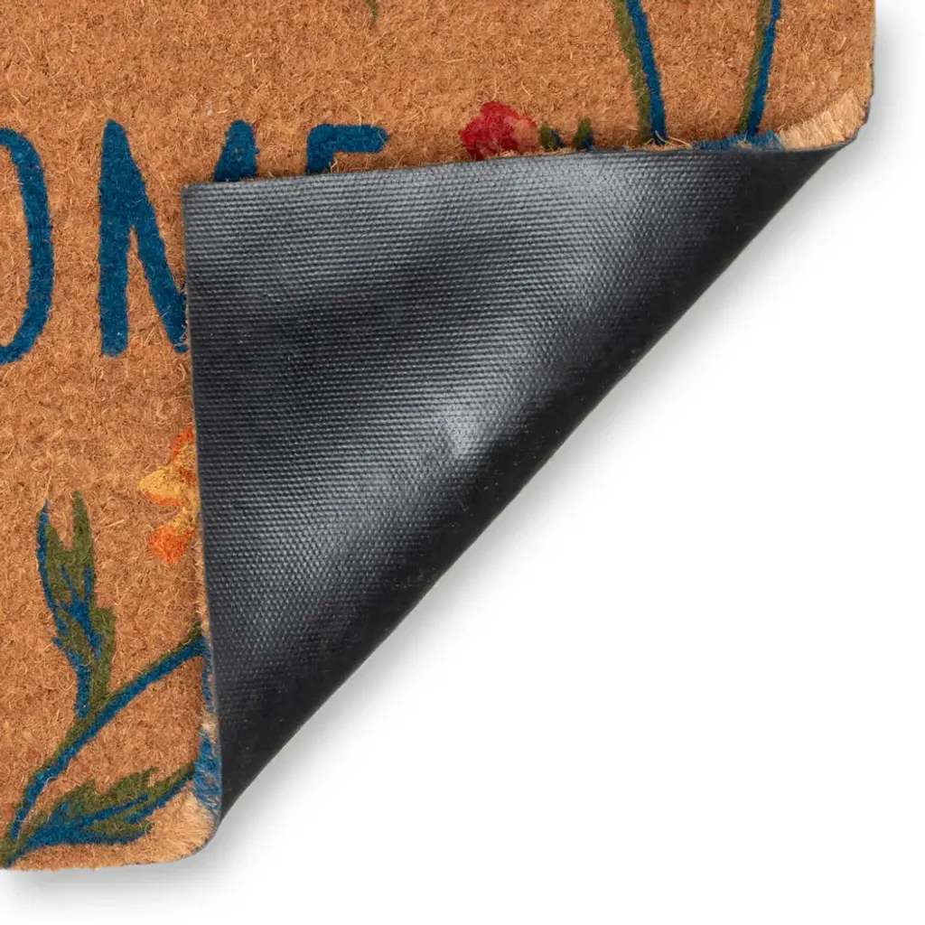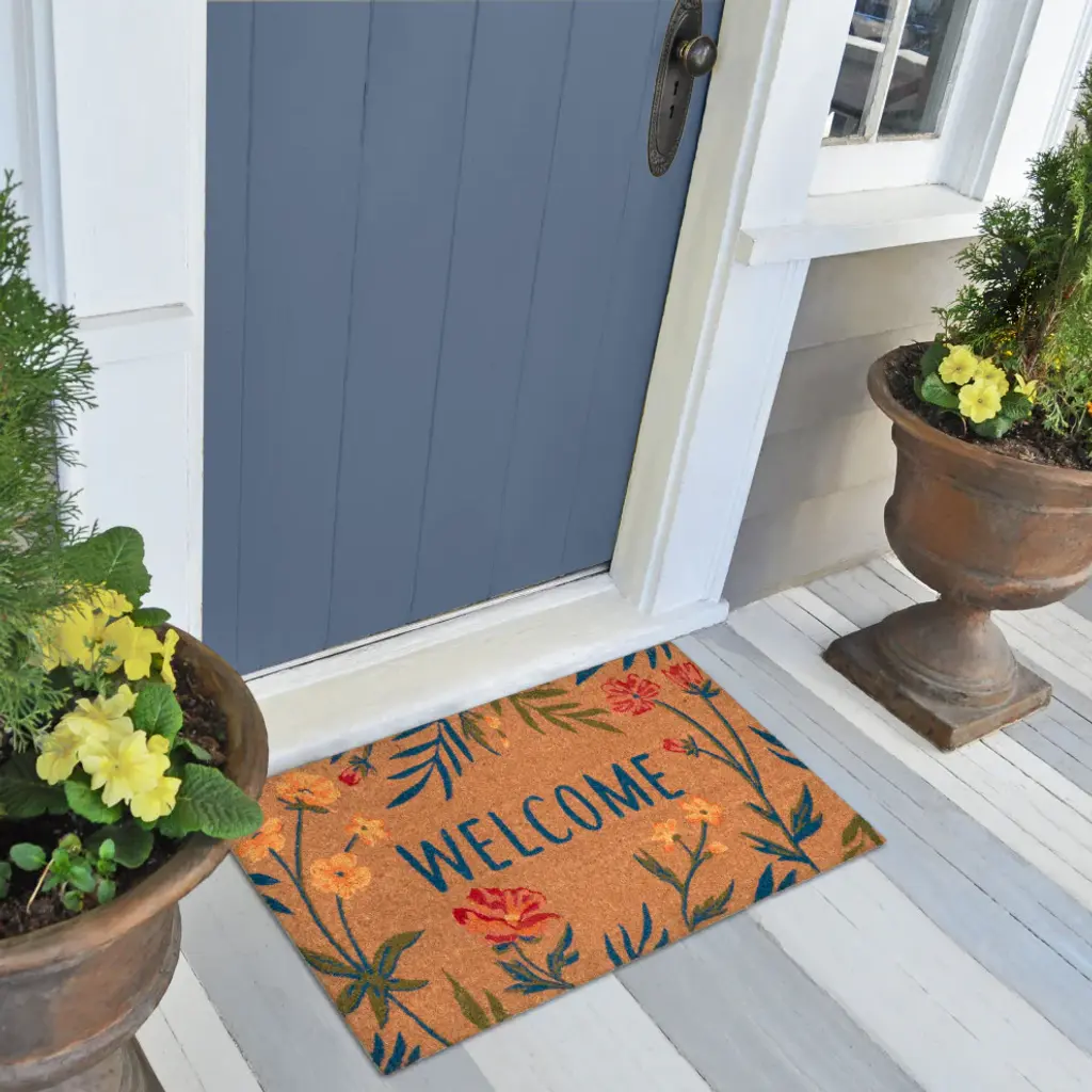 The Floral Welcome coir mat features whimsical red and yellow flowers with green leaves scattered around the edge creating a floral border design with a center welcome greeting written in blue on a natural background.