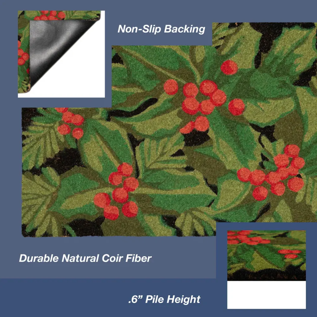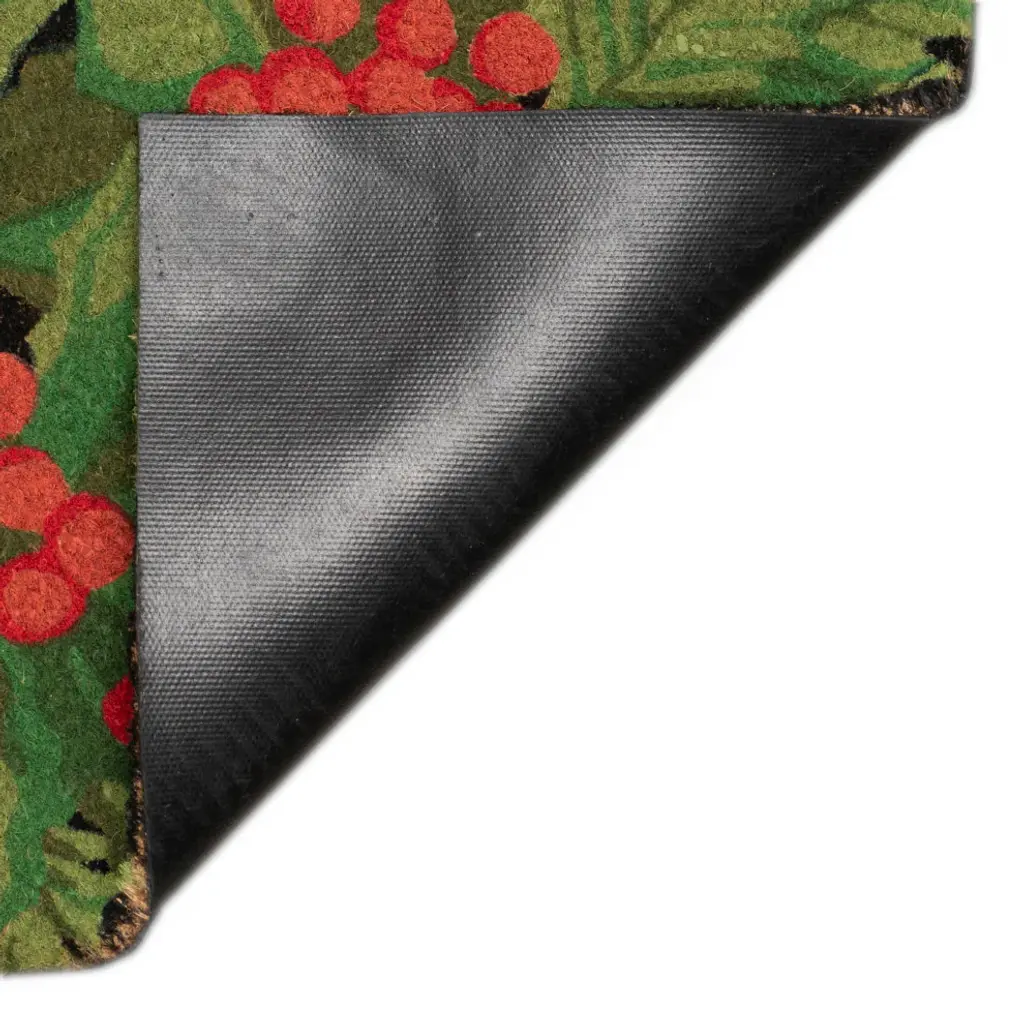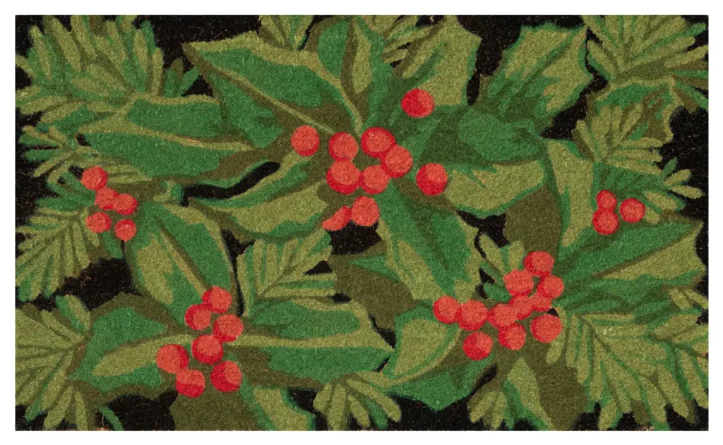 The Holly berries winter mat features a bold black background with bright green holly leaves decorated with red berries, bringing the holiday spirit to your outdoor space.