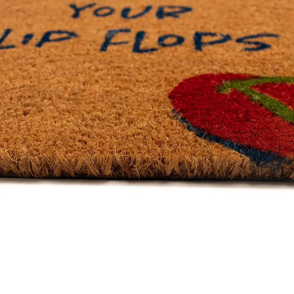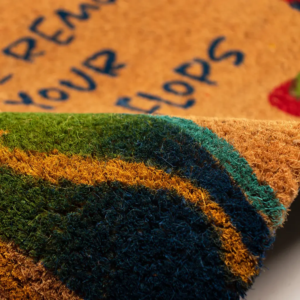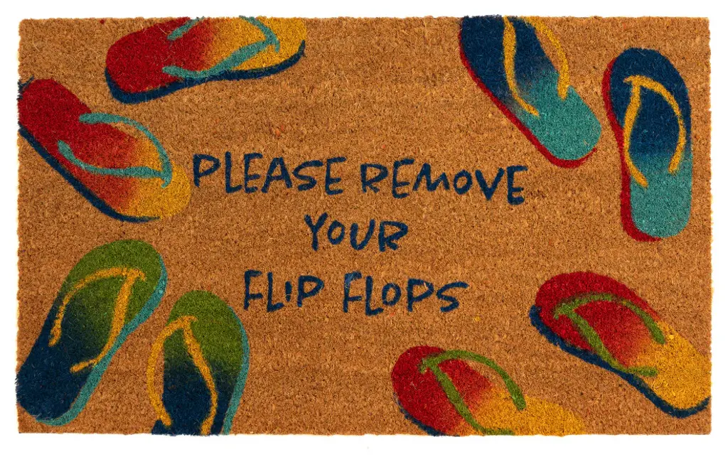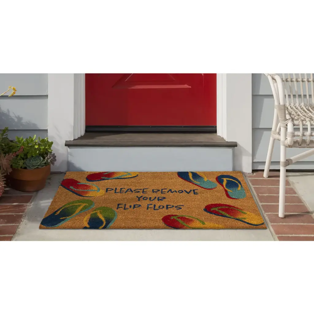 Our Remove Your Flip Flops mat will add a fun, coastal vibe making it the perfect accent piece for your entry. This coir utility mat is both stylish and practical. Natura coir doormats are durable and beautiful. Crafted from 100% coir which is an all-natural material known for its strength. Coir is eco-friendly, made from natural fibers which are extracted from the outer shell of a coconut known for its strength and durability. Natura coir mats feature a durable vinyl back and a stiff, durable natural coir front perfect for wiping shoes before entering the home, keeping it tidy. They are available in a wide variety of designs ranging from classic and inspirational to nautical patterns. Dyes saturate the fibers for long-lasting color.