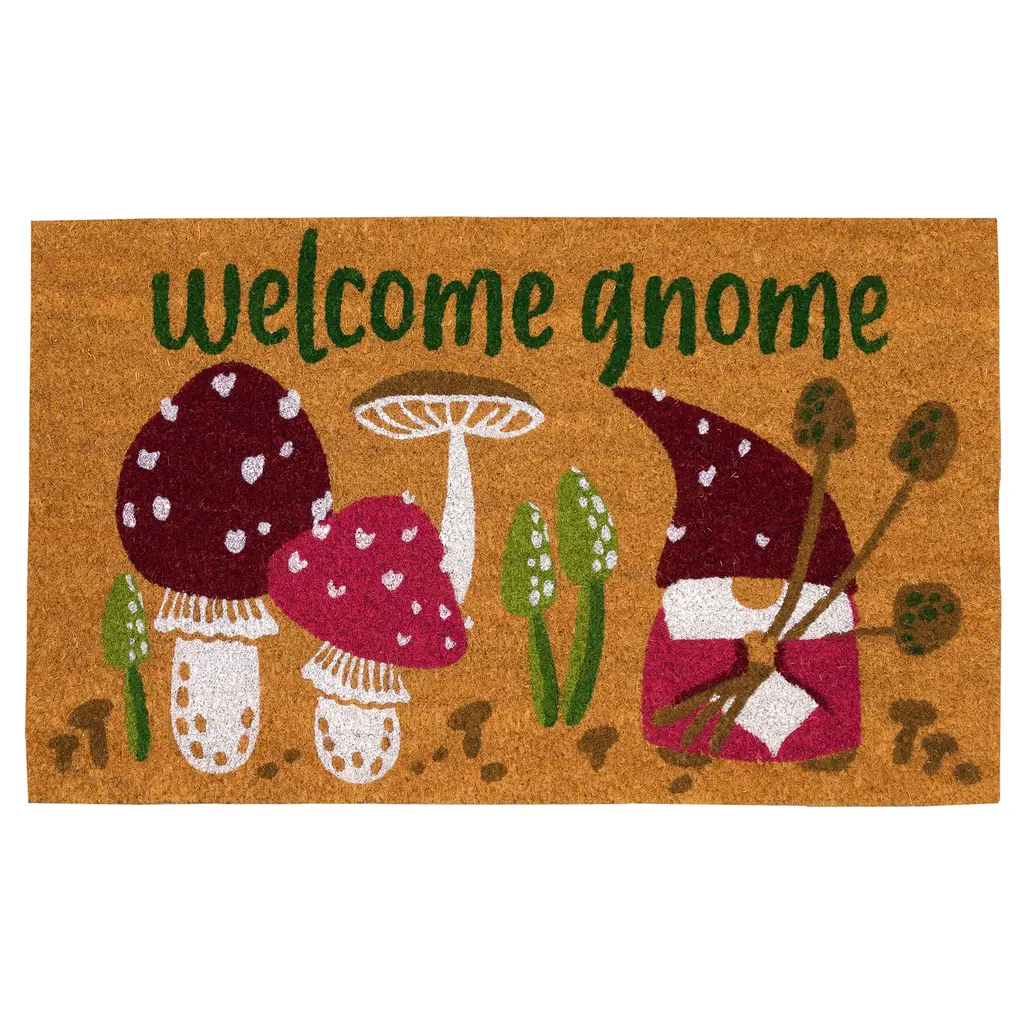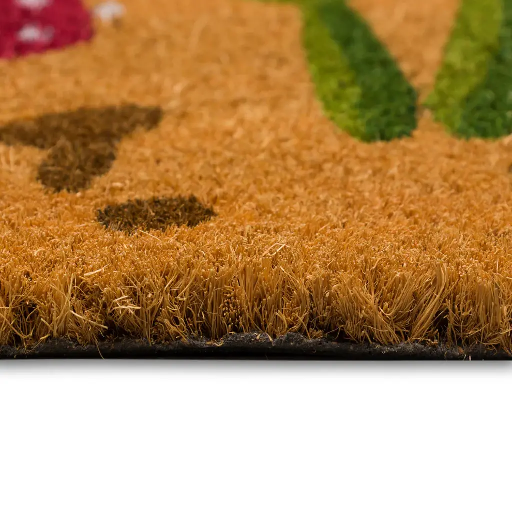 Our cheerful Winter Gnome mat features a delightful gnome surrounded by a garden of mushrooms and happy plants. This coir utility mat is both stylish and practical, in red. Natura coir doormats are durable and beautiful. Crafted from 100% coir which is an all-natural material known for its strength. Coir is eco-friendly, made from natural fibers which are extracted from the outer shell of a coconut known for its strength and durability. Natura coir mats feature a durable vinyl back and a stiff, durable natural coir front perfect for wiping shoes before entering the home, keeping it tidy. They are available in a wide variety of designs ranging from classic and inspirational to nautical patterns. Dyes saturate the fibers for long-lasting color.