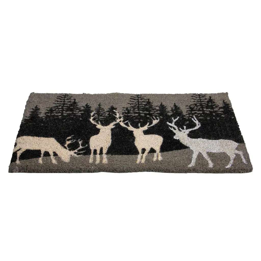 Adorn your doorways this Christmas season, with this outdoor reindeer doormat while also protecting your floors and carpets from outside debris. It will provide a festive entry with reindeer in the forest design while doing double-duty trapping in dirt and moisture. Made from durable coir brush mat fibers, it will withstand your family and friends' foot traffic. Product Features: Rectangular natural coir door mat Designed with 4 reindeer and a wintry forest background Glitter accents Skid-resistant backing Heavy duty construction for lasting durability Perfect for the front door, porch, or garage area Recommended for outdoor only Care instructions: vacuum, sweep or lightly hose clean Dimensions: 0.75"H x 30"W x 18"D Material(s): coir/PVC