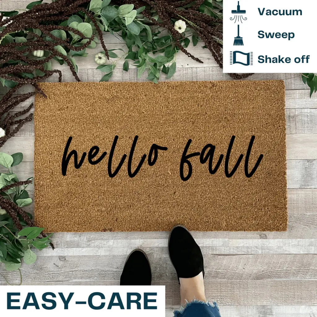 Our Hello Fall Doormat is the perfect way to welcome fall guests. Our welcome mats are hand-painted and made to order just for you. Our doormats are made from 100% natural coconut coir, adding functional beauty to porch decor. Welcome family and friends to your home with this unique piece of art that can''t be found anywhere else! Nickel Designs doormats are an affordable, ideal housewarming gift for newlyweds or your friends.We suggest that you keep your mat as dry as possible to avoid darkening of the fibers. To clean, simply shake out"¦easy as that! •Standard size, 18 x 30 inches to fit most doors.•Hand painted in the USA and made from natural coir fibers for mold, mildew resistance.•Extra durable, thick vinyl backing ensures no dangerous slippage when used.