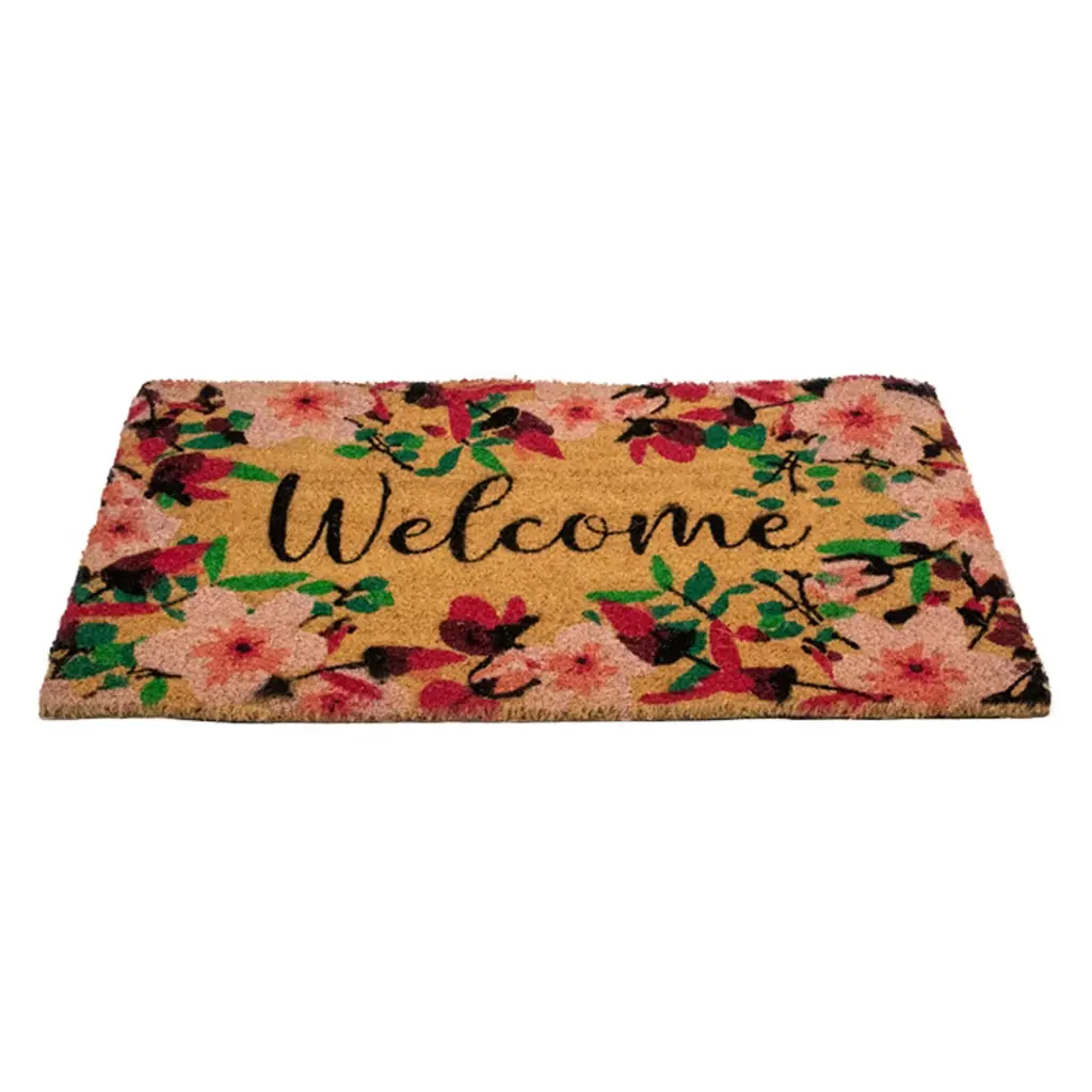 Adorn your doorways with this outdoor "Welcome" doormat while also protecting your floors and carpets from outside debris. It will provide a pop of color with its floral design while doing double-duty trapping in dirt and moisture. Made from durable coir brush mat fibers, it will withstand your family and friends' foot traffic. Product Features: Rectangular natural coir door mat Reads "Welcome" in black cursive writing Designed with blossoming pink flowers Skid-resistant backing Heavy duty construction for lasting durability Perfect for the front door, porch, or garage area Recommended for outdoor use Care instructions: vacuum, sweep or lightly hose clean Dimensions: 0.75"H x 30"W x 18"D Material(s): coir/PVC