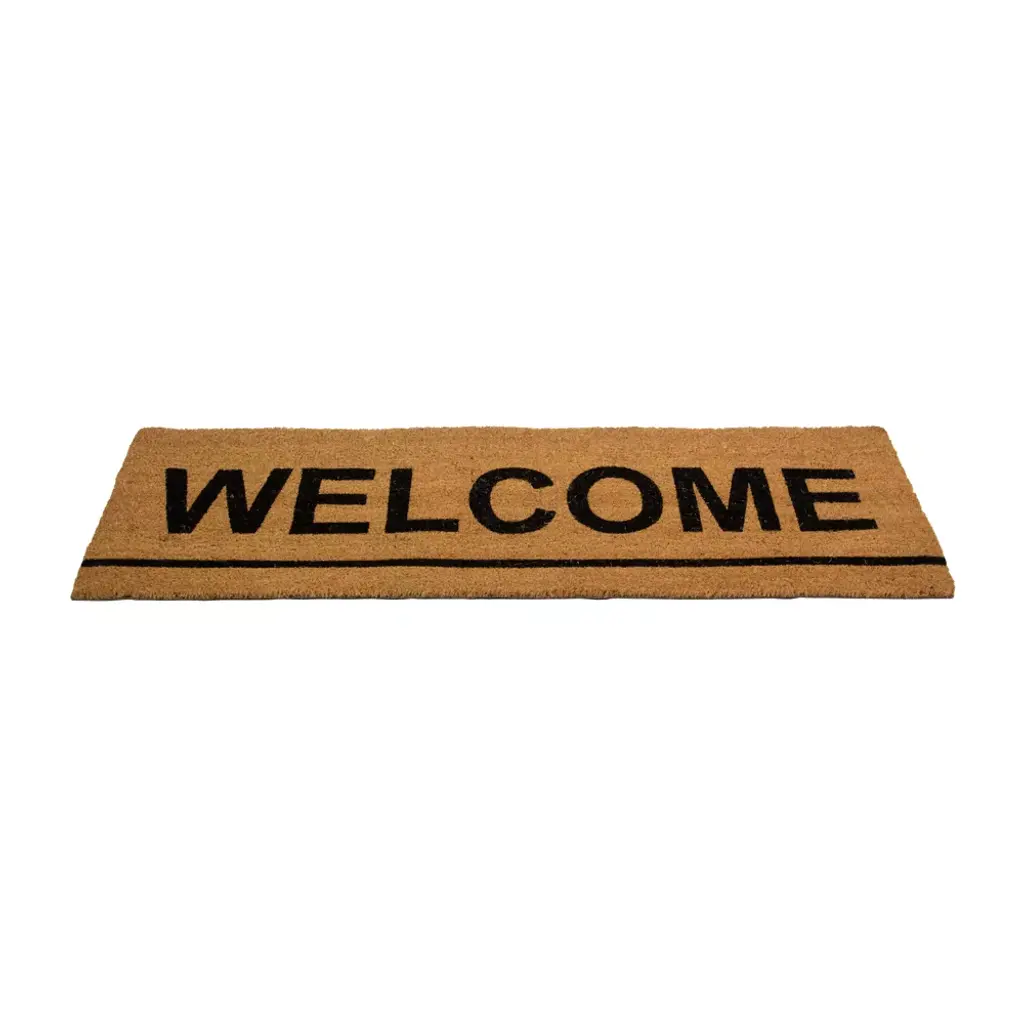 Adorn your doorways with this outdoor "Welcome" doormat while also protecting your floors and carpets from outside debris. It will provide a fashionable entryway with an inspirational message while doing double-duty trapping in dirt and moisture. Made from durable coir brush mat fibers, it will withstand your family and friends' foot traffic. Product Features: Rectangular natural coir door mat Reads "Welcome" in black cursive writing Skid-resistant backing Heavy duty construction for lasting durability Perfect for the front door, porch, or garage area Recommended for outdoor use Care instructions: vacuum, sweep or lightly hose clean Dimensions: 0.75"H x 48"W x 16"D Material(s): coir/PVC