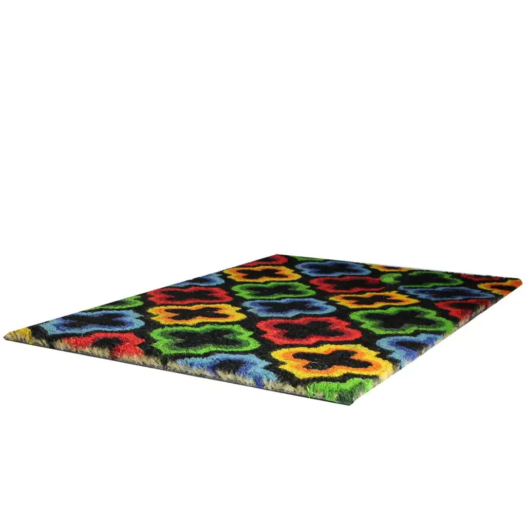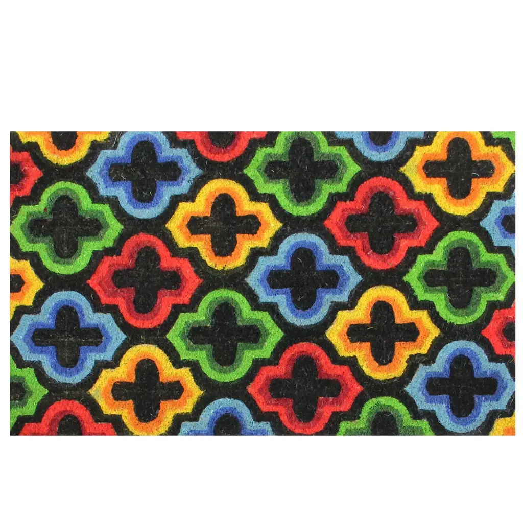 Welcome guests with this ornamental doormat! It features multi-colored retro geometric designs. This doormat has been made for long-lasting durability and color. Product Features: Features green, red, yellow and blue color outdoor mat There is a retro Moroccan pattern Mat has a black background Non-skid durable backing which helps to keep your doormat securely in place Recommended for both indoor or outdoor use Care instructions: rinse with a hose and air dry Dimensions: 17.75"H x 29.5"W x .5"D Material(s): rubber bottom/coir fibers