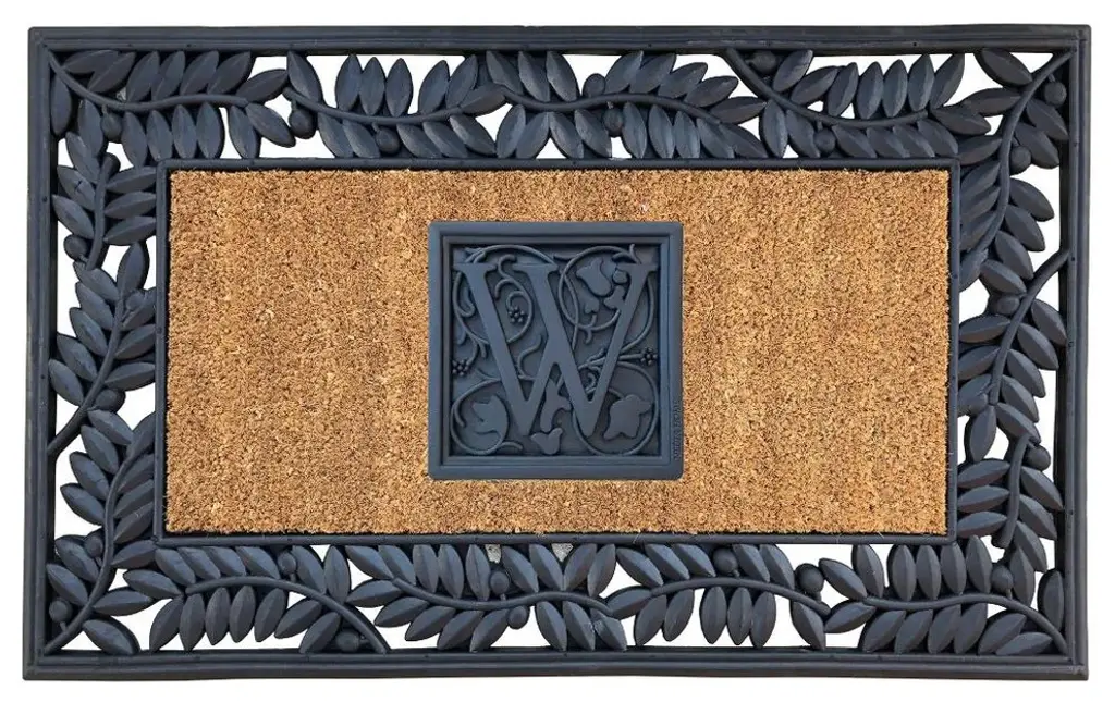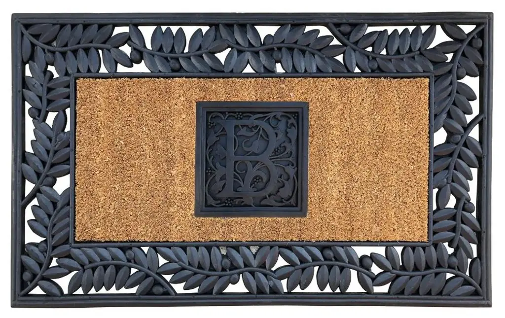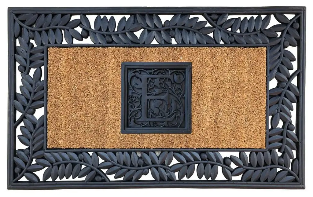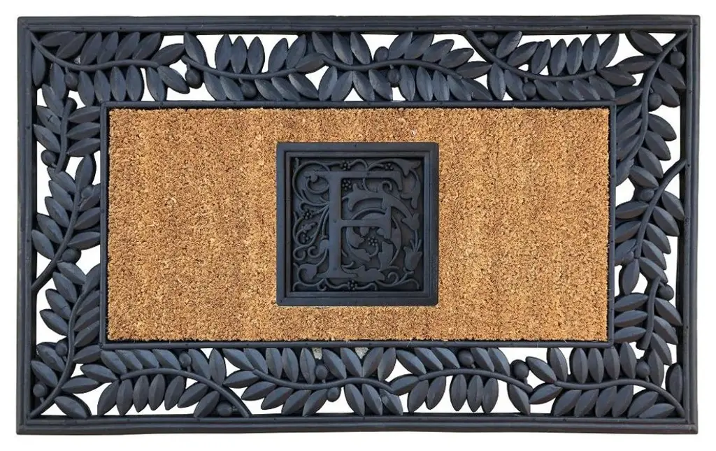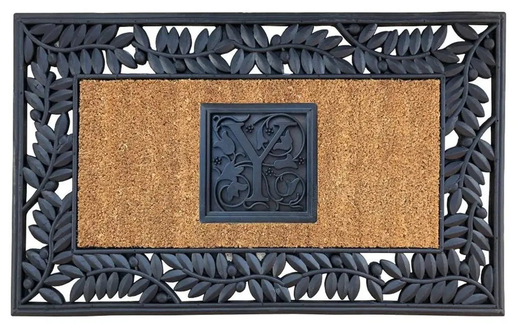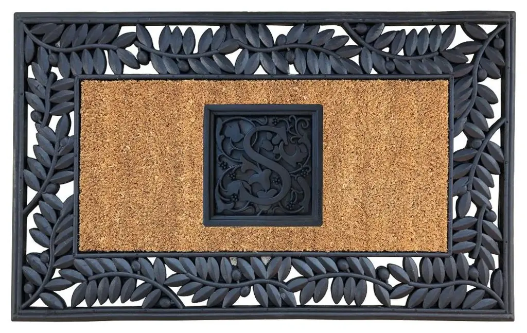Available in a classic olive branch border design. Features a coir fiber mat tucked within a molded rubber olive branch frame. Durable and Functional. Heavy rubber backing, and border keeps mat in place. The open scroll work border has the appearance of wrought iron but the easy care and durability of molded rubber. Coir fiber is naturally mold and mildew resistant and are locked in place to minimize shedding. Eco-friendly and biodegradable. The ability to personalize with your single initial gives a unique touch to this doormat.