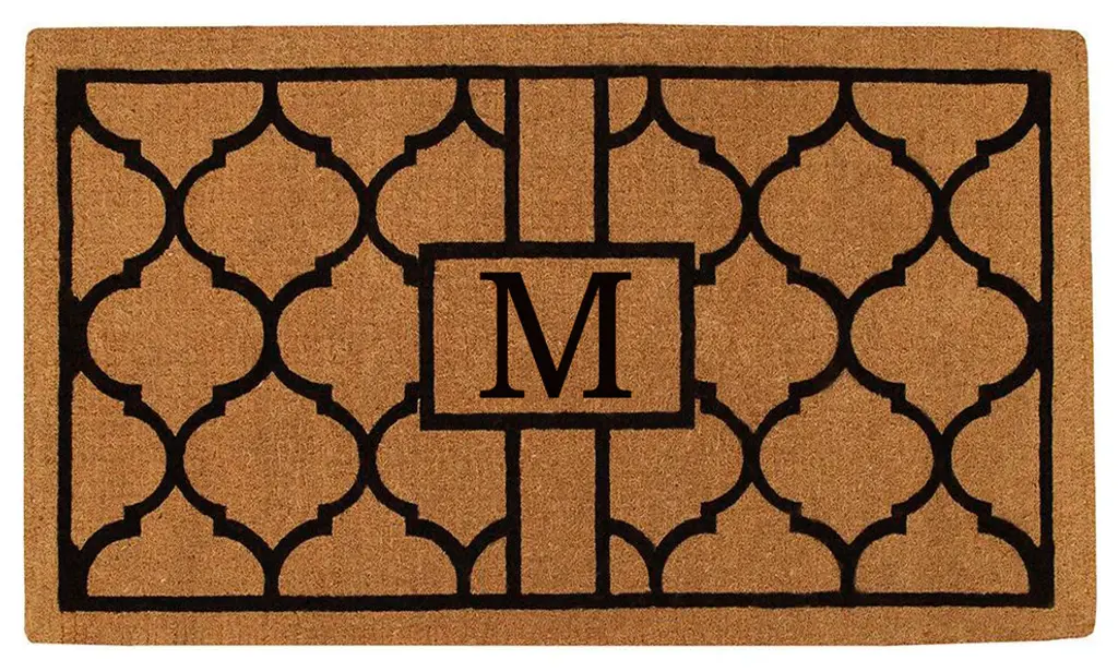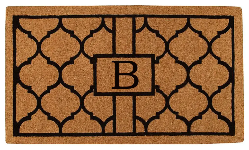 Over-sized for larger areas, this gorgeous monogrammed doormat is expertly made by hand. Made of 100% coir, this durable, heavy-duty fiber is earth friendly, naturally abrasive to scrape shoes clean, retains its shape no matter the foot traffic and absorbs moisture. Height is 1"-2". vacuum, sweep or lightly hose clean.