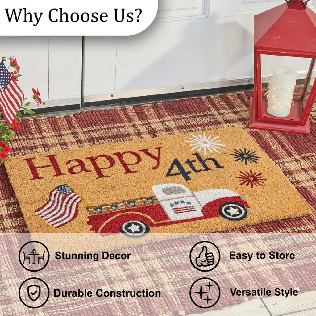 Celebrate Independence Day at your home with this inspiring red, white, and blue doormat featuring designs of the United States flag and expressive fireworks. This durable, skid resistant doormat is made from all-natural fibers for long-term use. Comprised of a hand-printed design with a celebratory text that makes it the perfect addition to your Fourth of July decor.