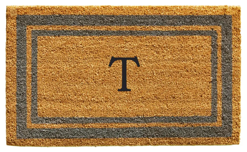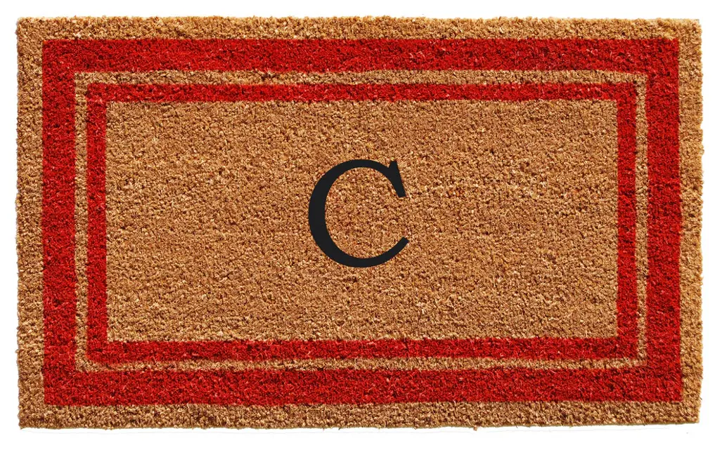 Brighten your home entry with this beautiful monogrammed doormat. Made of natural coir, a durable fiber that scrapes shoe bottoms clean, this doormat has a prominent double border that encases your initial and is vinyl backed to help prevent movement when walked on. Weather tolerant and colorfast, coir doormats absorb moisture, retain their shape and do not mat down regardless of the traffic. Vacuum, shake or lightly hose clean and allow to dry.